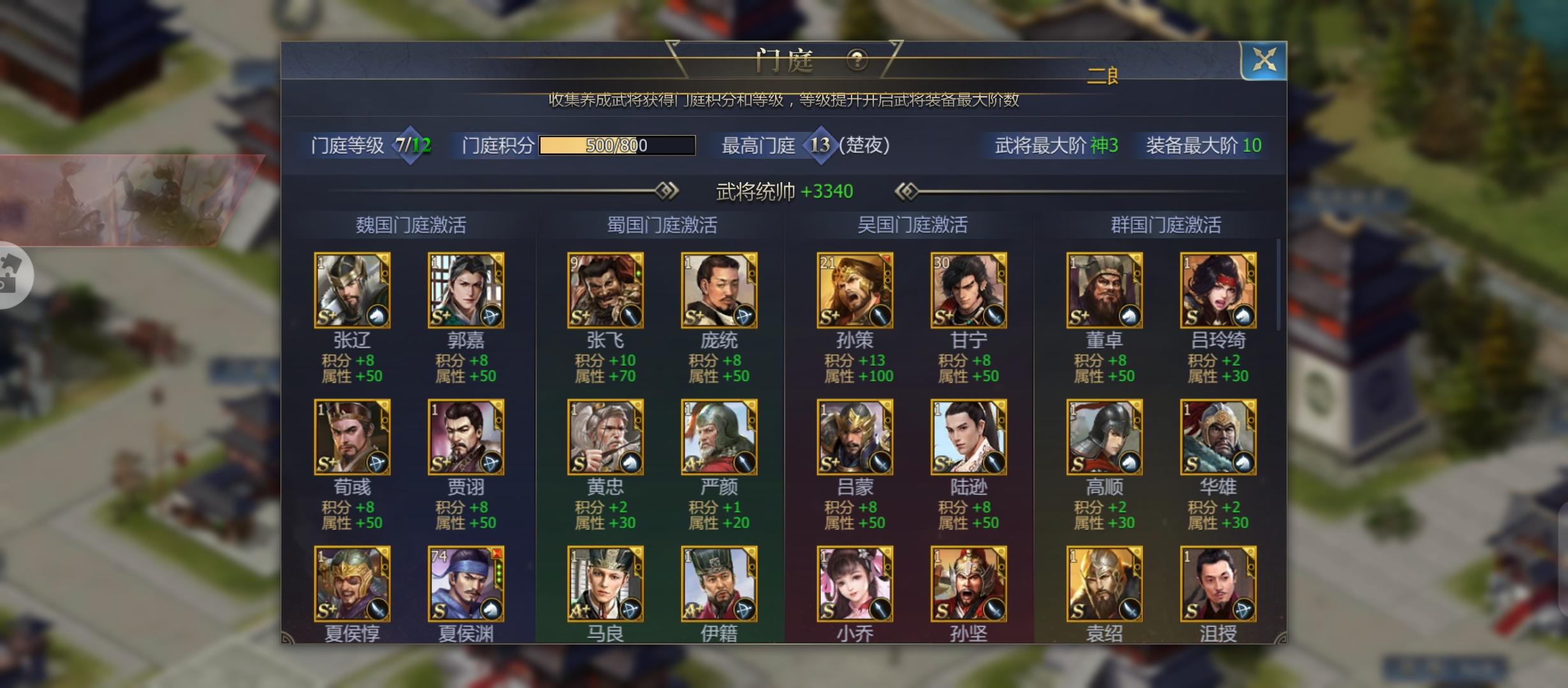 收集武将可以解锁门庭等级,门庭等级越高武将可进阶的等级越高,详细积分规则可以点击文化查看