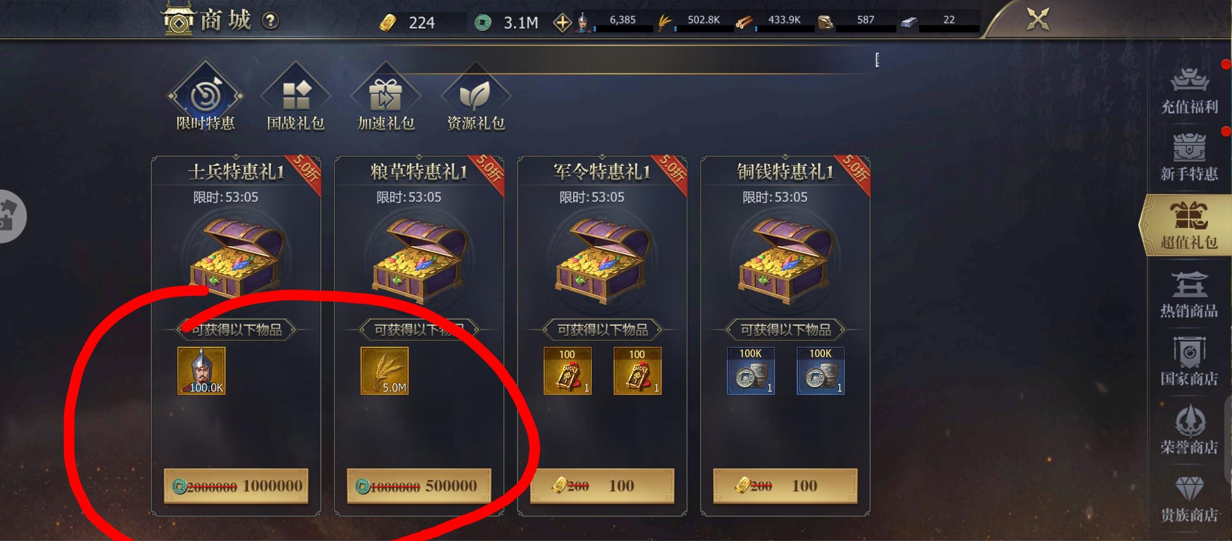 超值礼包每天都有便宜的士兵,粮草出售,买完粮草入库可以赚取一倍铜钱