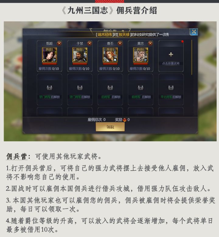 开创全新SLG类游戏的“放置”玩法 针对SLG国战策略游戏,开创全新SLG类游戏的“放置”玩法,可以自动开启“智能辅助”操作,玩家操作将由智能AI自动操作,解放玩家的双手,让玩家轻松畅享游戏乐趣
