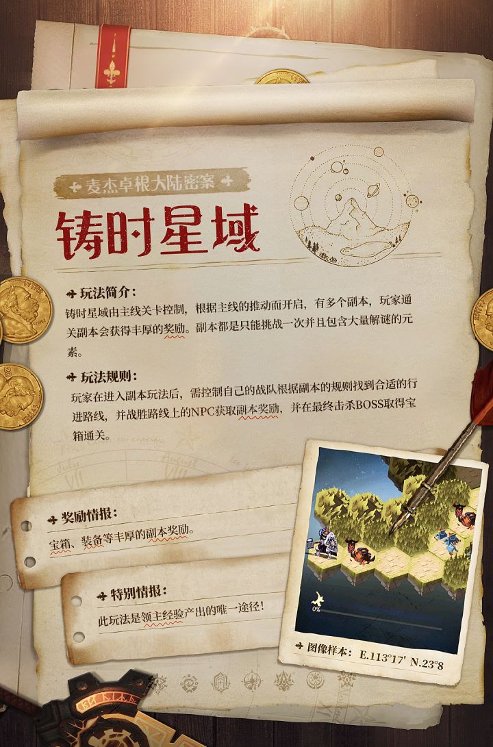 【铸时星域】 —— 探索未被开发的可能性之地麦杰卓根大陆还有很多未被探索的地方,领主可以在铸时星域进行探索那里有着大量隐藏机关,也藏着未被找到的被遗忘的宝藏......当然也是危机四伏随着主线关卡的推进,领主能逐渐解锁更多不同的区域进行探索在里面也能遇到很多并肩作战过的熟悉的面孔,英雄们一起撰写属于自己的特殊剧情,是进一步了解剧情、世界观,以及英雄性格和经历的好地方在每一张铸时星域副本内