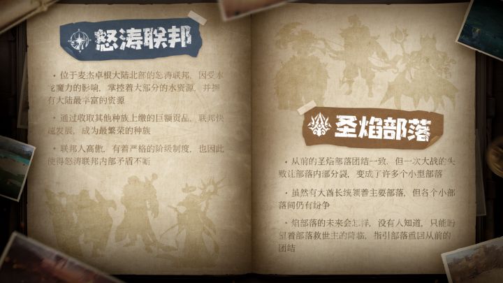 【怒涛联邦】 —— 秩序使我们团结而强大位于麦杰卓根大陆北部的怒涛联邦,因受水龙魔力的影响掌控着大部分的水资源,并拥有大陆最丰富的资源通过收取其他种族上缴的巨额贡品,联邦快速发展,成为最繁荣的种族联邦人高傲,有着严格的阶级制度,也因此使得怒涛联邦内部矛盾不断【圣焰部落】 —— 鲜血、力量、与荣耀从前的圣焰部落团结一致,但一次大战的失败让部落内部分裂,变成了许多个小型部落虽然有大酋长统