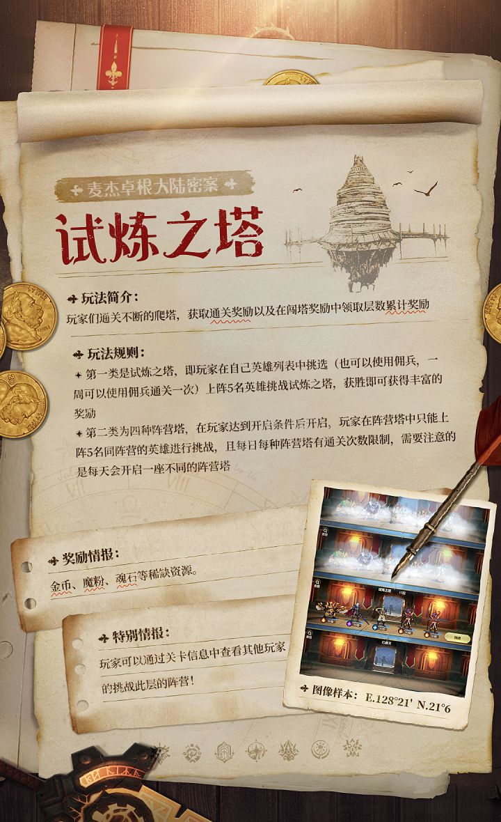 在麦杰卓根大陆中央,有一座直穿云霄的高塔,里面被暗影的仆从占据,保护着掠夺回来的财宝领主们需要进入击败他们,不断的攀登试炼之塔,同时获得财宝来强化自身,以面对更加黑暗凶悍的敌人敌人偷偷藏了大量钻石和紫色英雄碎片,击败他们就能将宝藏收入囊中试炼之塔的部分区域限时开放,并且只对特定的阵营英雄开放(比如怒涛神殿只允许上阵怒涛联盟的英雄)要求各位领主更具挑战性的搭配阵容和培养英雄以应对不同的战斗需