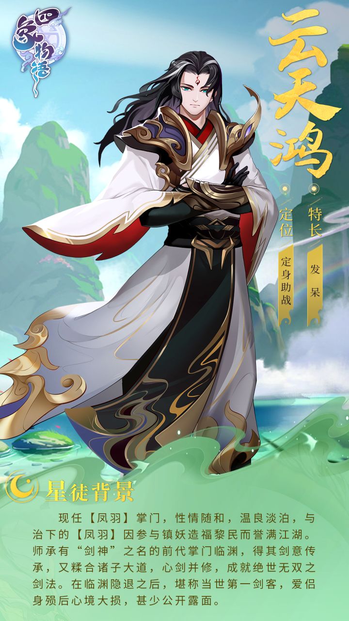 “孤月凭栏远,剑影饮江流。”——云天鸿现任【凤羽】掌门,性情随和,温良淡泊,与治下的【凤羽】因参与镇妖造福黎民而誉满江湖。师承有“剑神”之名的前代掌门临渊,得其剑意传承,又糅合诸子大道,心剑并修,成就绝世无双之剑法。在临渊隐退之后,堪称当世第一剑客,爱侣身殒后心境大损,甚少公开露面。阵营:朱雀性格/定位:云淡风轻/闪避真伤喜欢/讨厌:流云/为人胁迫☞《四象物语》现已全平台开启!登录即