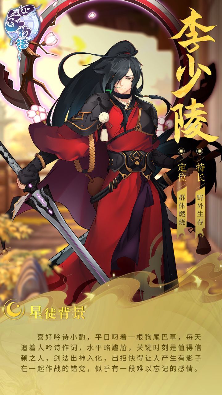 “今朝有酒今朝醉。”——李少陵喜好吟诗小酌,平日叼着一根狗尾巴草,每天追着人吟诗作词,水平略尴尬,关键时刻是值得信赖之人,剑法出神入化,出招快得让人产生有影子在一起作战的错觉,似乎有一段难以忘记的感情。阵营:朱雀性格/定位:风流不羁/超多段攻击喜欢/讨厌:吟诗自斟/薄情寡性者——————————◑◑◐◐———————————☞《四象物语》现已开启预约TapTap>>https://