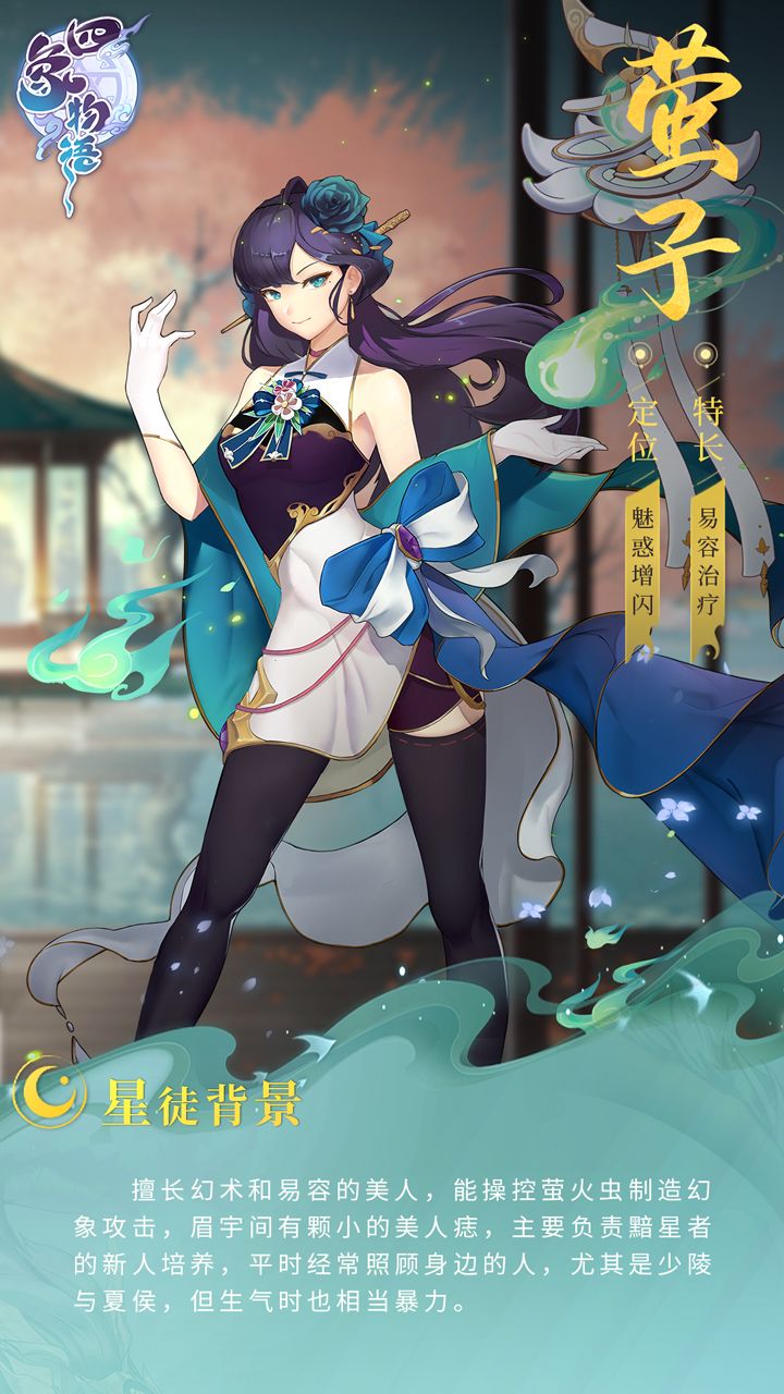 “乖,姐姐会好好疼你们的。”——莹子擅长幻术和易容的美人,能操控萤火虫制造幻象攻击,眉宇间有颗小的美人痣,主要负责黯星者的新人培养,平时经常照顾身边的人,尤其是少陵与夏侯,但生气时也相当暴力。阵营:玄武性格/定位:可爱御姐/魅惑增闪喜欢/讨厌:夏侯信/夏侯信——————————◑◑◐◐———————————☞《四象物语》现已开启预约官网>>https://sxwy.shengtia