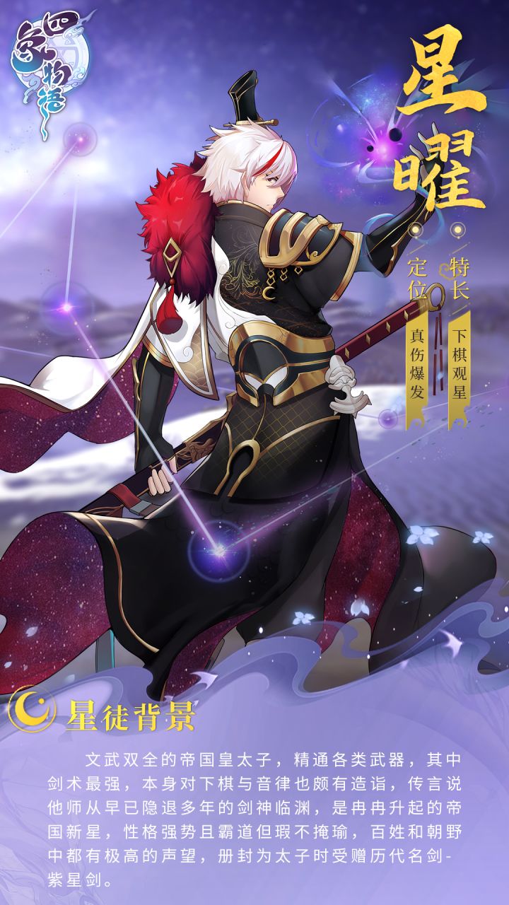 “英雄者,包藏星辰之胸怀,吞吐天地之志向”——星曜 文武双全的帝国皇太子,精通各类武器,其中剑术最强,本身对下棋与音律也颇有造诣,传言说他师从早已隐退多年的剑神临渊,是冉冉升起的帝国新星,性格强势且霸道但瑕不掩瑜,百姓和朝野中都有极高的声望,册封为太子时受赠历代名剑-紫星剑。阵营:青龙性格/定位:霸道/真伤爆发喜欢/讨厌:赢/输☞《四象物语》首发定档8月4日!首日登录即可领取专属称号