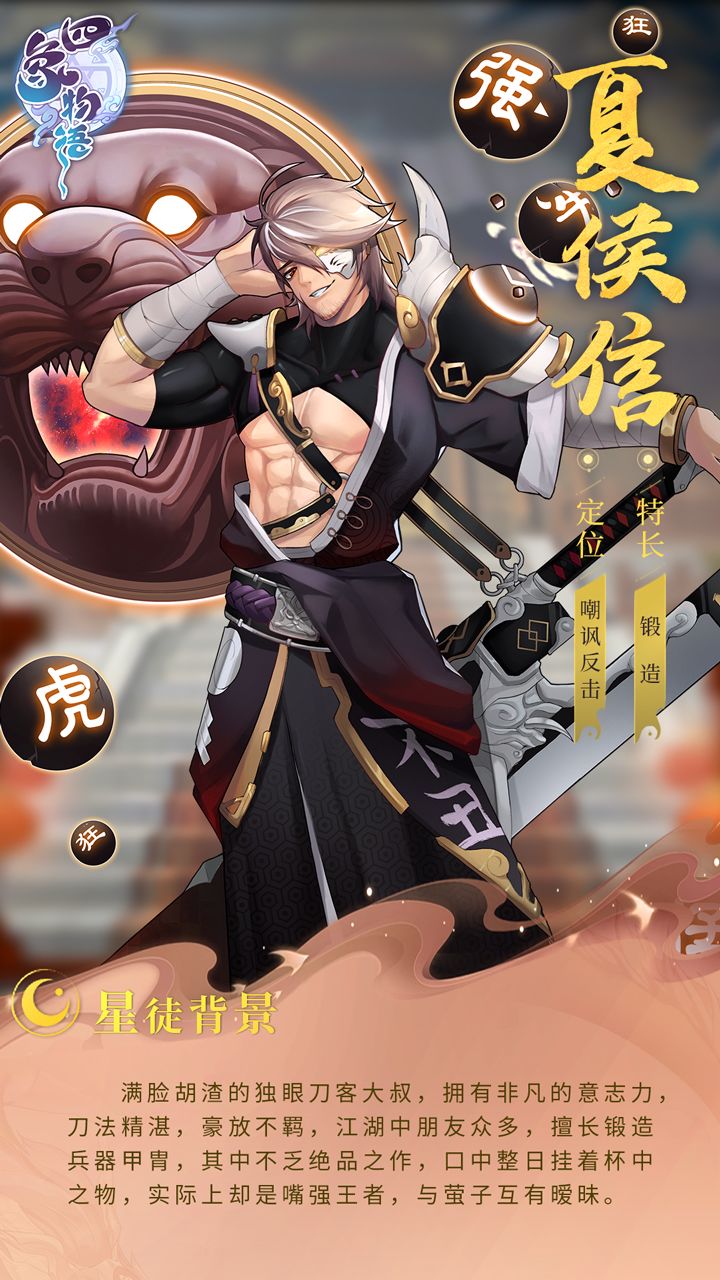 “天下唯美酒与美女不可负”——夏侯信 满脸胡渣的独眼刀客大叔,拥有非凡的意志力,刀法精湛,豪放不羁,江湖中朋友众多,擅长锻造兵器甲胄,其中不乏绝品之作,口中整日挂着杯中之物,实际上却是嘴强王者,与萤子互有暧昧。阵营:白虎性格/定位:豪放洒脱/嘲讽反击喜欢/讨厌:搭讪宴请/轻薄之人——————————◑◑◐◐———————————☞《四象物语》现已开启预约官网>>https://s