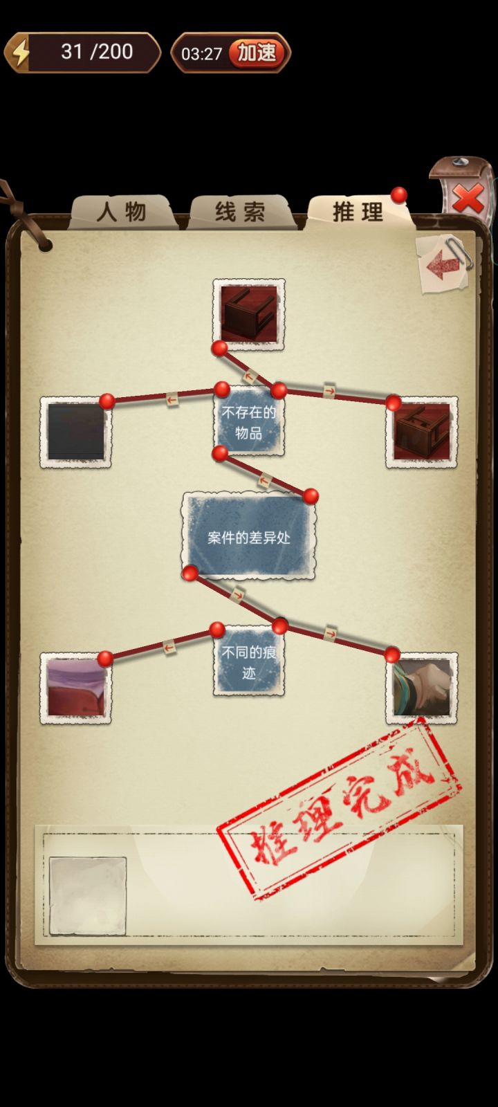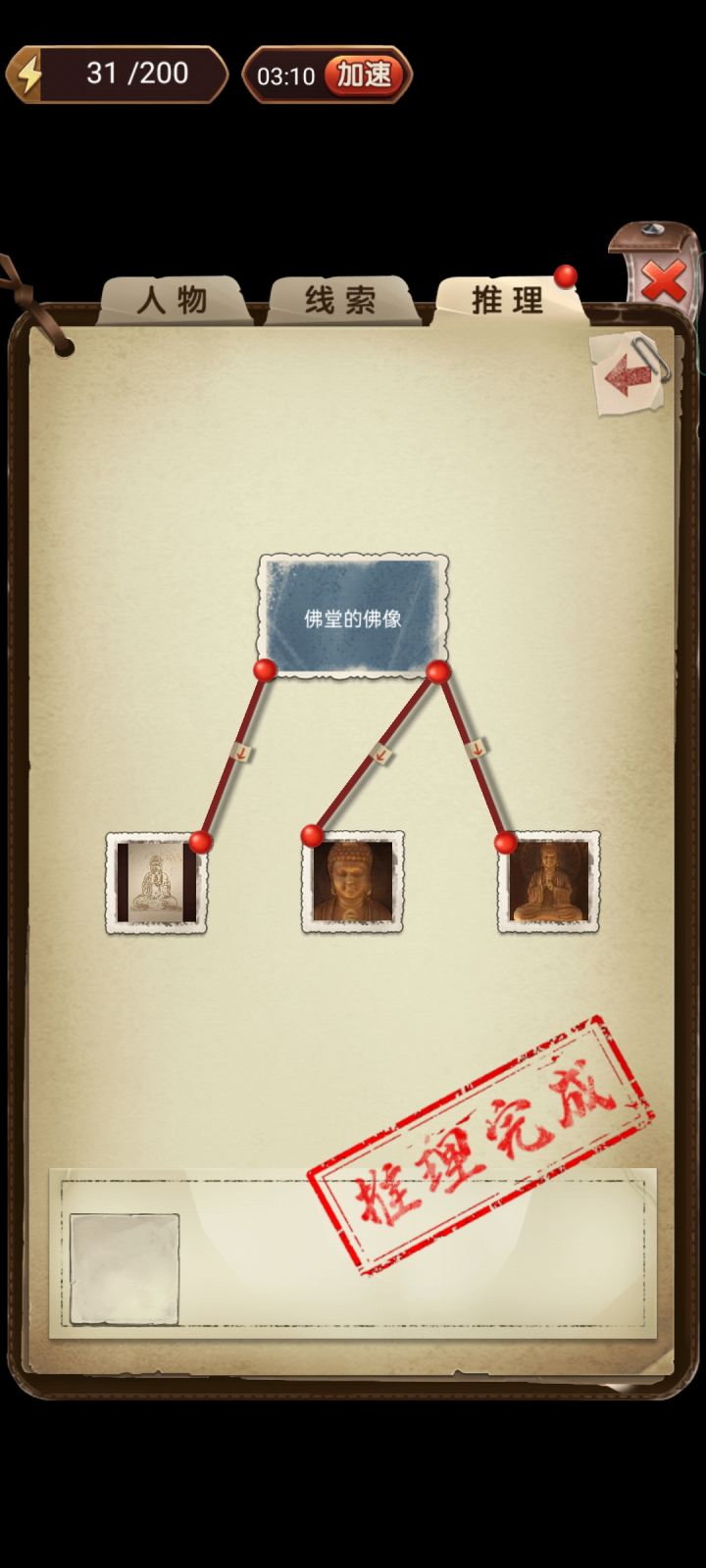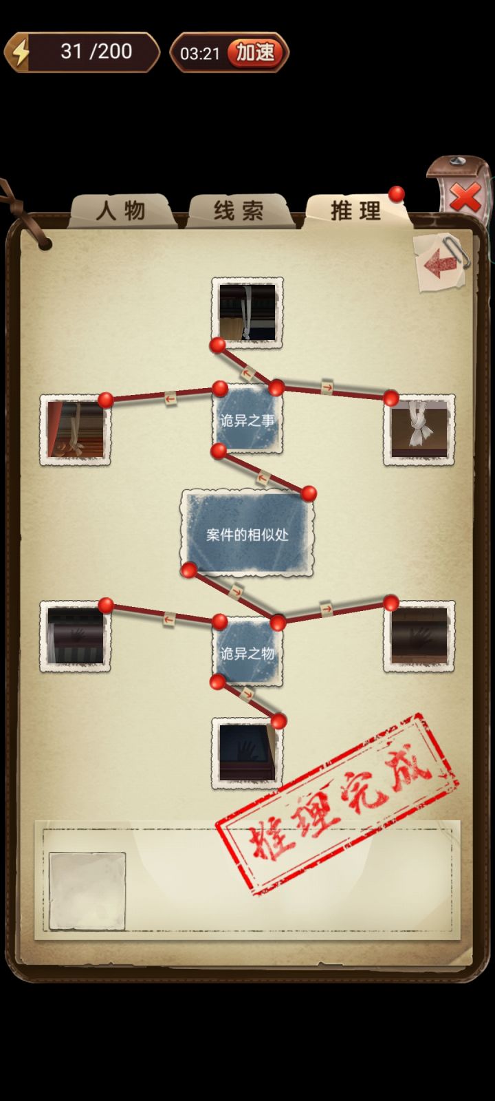 第二章剧情线索1.【黎水水“狐狸精”】2.【请来的安宅道长】3.【慕轻烟待人友善】→处事待人4.【请来的佛像】5.【紧张的关系】6.【半个主人】→关系线的梳理推理(推理验证10体力)1.关系线的梳理⑴关系线的梳理→谢金娥→关系不和→⑴【黎水水】→【黎水水“狐狸精”】,⑵【慕轻烟】→【紧张的关系】⑵关系线的梳理→谢金娥→关系和缓→⑴【钱通神】→【半个主人】,⑵【任白云】→【请