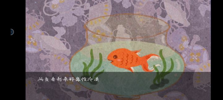 第一次看到致郁标签的游戏,抱着好奇会是什么样的心态来玩的,但玩下来我觉得还挺轻松诙谐的,可能和我没养过小动物有关吧orz下面涉及剧透,整个游戏过程就是对鱼。如果想玩到全部剧情,可以每一次都选吃了它,再反悔继续养大。选项的话可以每次点点新出的选项,其余全选“说话”,因为选项本身不会对游戏产生影响,反而“说话”里面的话很有意思,感觉开发者也是个很有趣的人,才能想出这么多奇奇怪怪不重复的话(每次说的第
