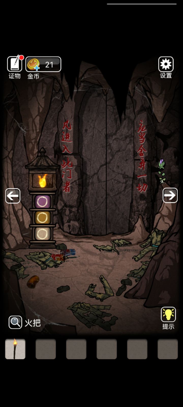 第一章要种三朵花解开石灯上的谜题。我刚种了两朵花(分别是入洞白色,嫁接紫色),知道符号后怕忘记,就去转石灯了,结果刚好三个符号都对上,门就开了。第三朵花(枯萎黄色)我根本都还没种??而且我当时连紫花场景的背包都没有发现,关于此石洞的背景(即孙大帅盗墓)都还没解锁,就进入下一关了,相当于直接跳过了两个步骤就进入石门了……这样挺不严谨的……希望官方可以改一下第一关石门的打开条件,要打开石门并进入石