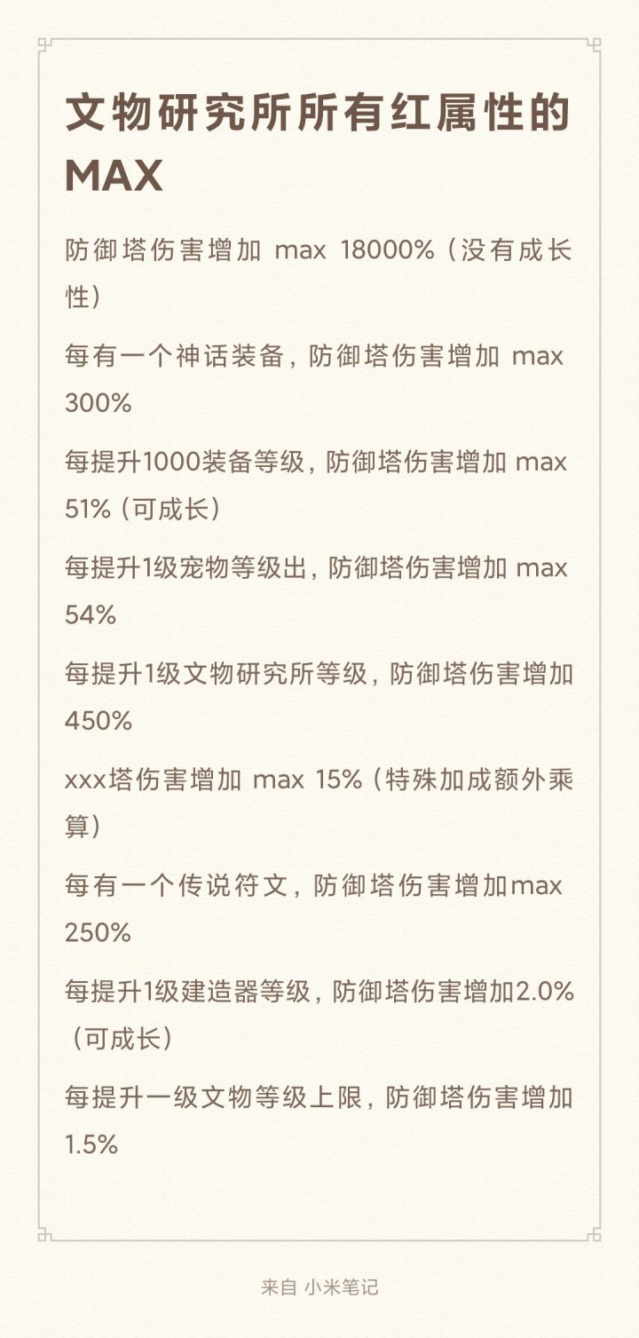 当层数到五万层的时候就可以把文物研究院拉满等级了,这样在线或离线收益可以最大化。下面介绍一下可以洗出的红属性附魔漏了一个xxx伤害增加max15%附魔的算法然后怎样洗才可以伤害最大化呢,个人建议可以无限升级到上限2万文物的加成的可以洗比如建造器之类的或者每1000级某某塔等级提高防御塔伤害51%的。剩下那些固定100,300之内等级的洗特殊附魔。也就是对应主塔对应伤害的特殊附魔!举个例子