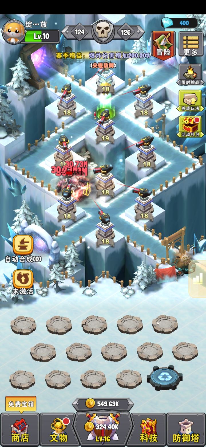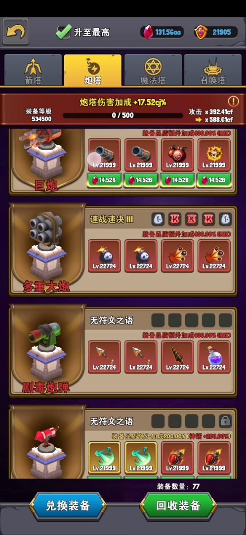 前期巨炮属实太强了吧,不知道后期还能不能这么强。。原本打起来后面还挺费劲,又要升级干啥的。。然后我忽然意识到,巨炮占伤害比九十九,不如全部放巨炮,然后就一路升 直接四百多到八百了,不知道再往后巨炮还是不是这么强啊