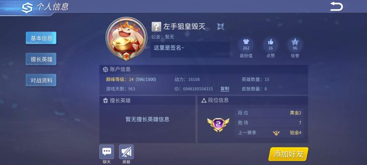 ID:6948185554315昵称:左手狙皇毁灭我从来没有遇到过这么恶心的队友先是挂机几分钟然后一直不稳定后面死了之后就发语音发一些很难听的声音啊啊啊啊啊啊呀呀呀呀之类的而且不是一次两次我玩游戏喜欢带耳机我比较喜欢听游戏的打击效果他发的语音差点把我送走还有这游戏是真没人了吗?这一把队友铂金黄金之前也有一次我钻石队友有黄金白银青铜既然匹配机制这样那还搞什么排位干嘛?