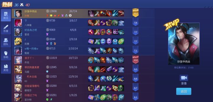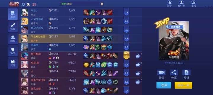 我前期对面直接进草,和孙策对a,打出小优势,逼出对面治疗,全程就我一个输出。很稳健 但是你们看看这个辅助,从头到尾站位一直都靠后,连个技能都懒得放,钻石1啊?虽然钻石一是个很水的分段,但是在不会玩,也不至于这样吧?还是说之前玩游戏被孙策打出阴影了?不至于吧,铁子们帮我研究研究,看看是谁的问题 还有辅助用的是大树,他整局全程都没有用过w技能,也就是那个类似禁锢的技能,我真服了,是怕近身被秒?你一个肉,大家都等级差不多经济差不多,能一套秒了你? 赛后我跟这个辅助进行了一场亲切的问候,真是吗了个1 还有我这局就是今天玩的, 后来排位的几把,也都是这样的辅助,是被制裁了吗?哦,对了,出现这种情况的时候可能是因为我今天玩的前几把有一局拿了个五杀,因为这一切都是五杀那把之后的,那把五杀局赢了之后,后面四五局都是这种队友