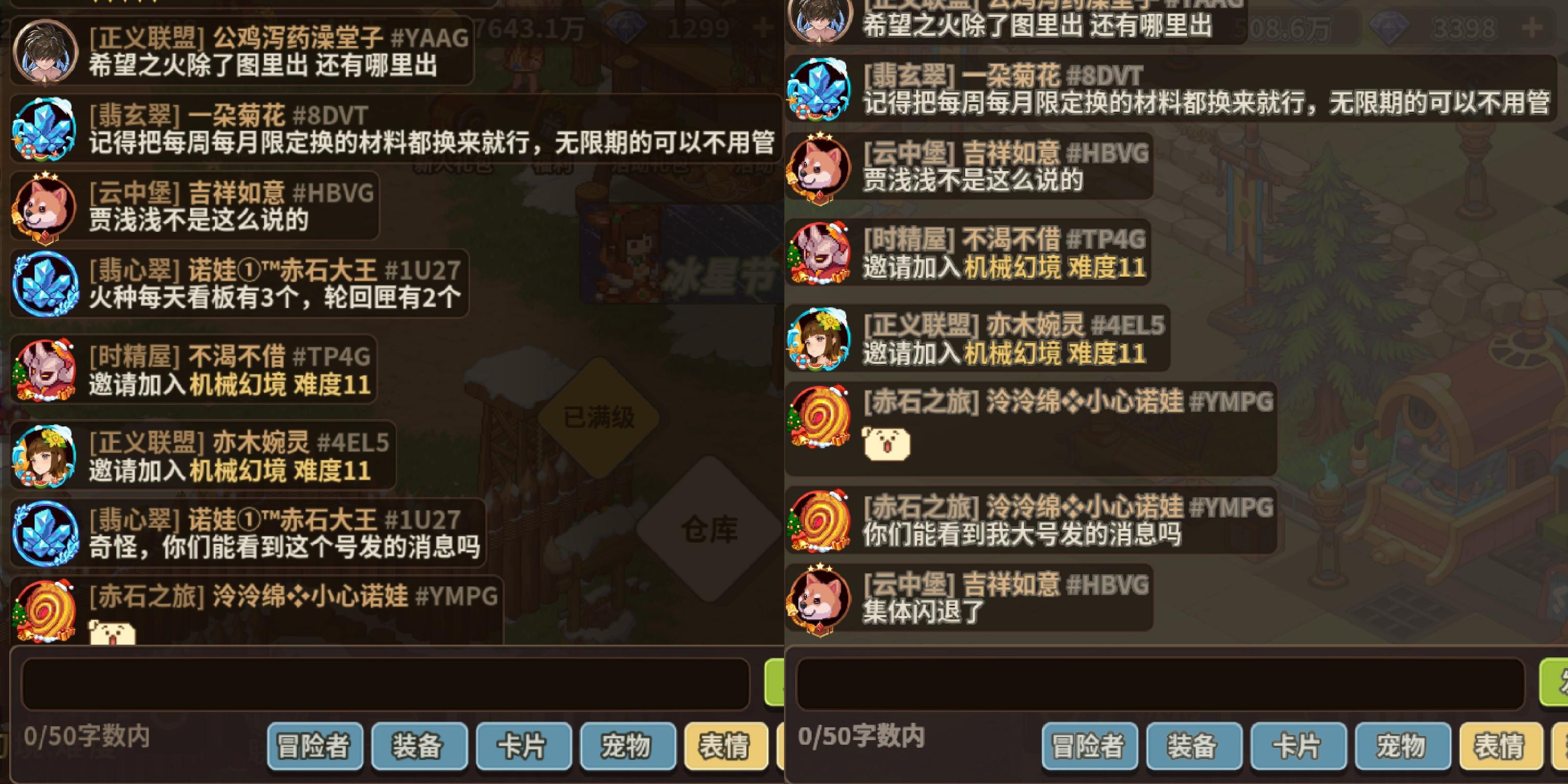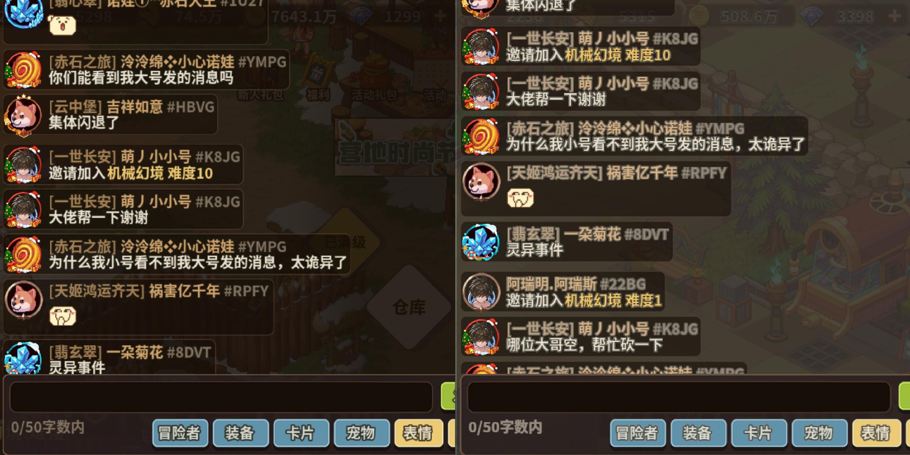 左边是大号,右边是一个小号.其实是莫名其妙触发的 bug总之大号对着空气讲了半天话而且只有自己能看到这堆消息有那么一瞬间我以为真的没人理我(顺带提一嘴,小号屏蔽列表是空的).(投问题反馈只是单纯不知道放哪个分类)(姑且算个客户端不同步的 bug)