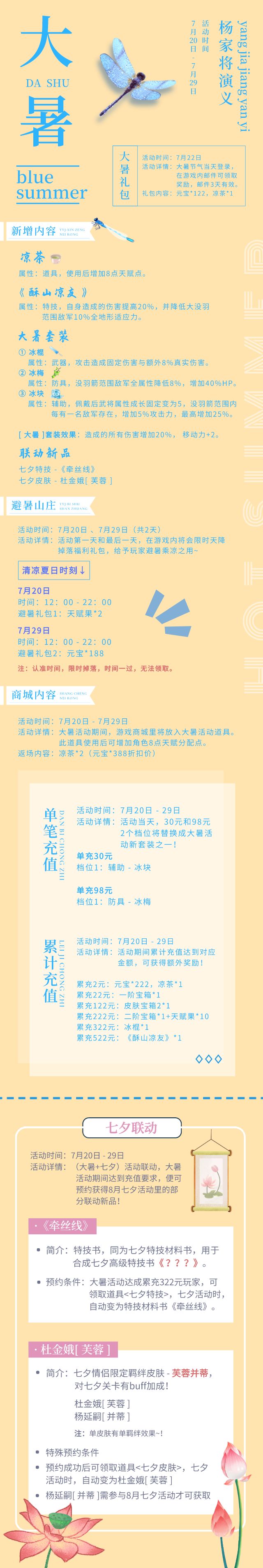 duang!duang!duang!🎐亲爱的杨家军们:“暑是煮,火气在下,骄阳在上,熏蒸其中为湿热,人如在蒸笼之中。”<大暑>真不愧是一年中最热的时候呀!不知道各位将军是否也感受到了热浪滚滚,酷暑难熬~真是开启了“ 烧烤💢模式 ”,果真为“ 热 ”不思“ 暑 ”呢 ❗在这炎炎大暑之际,《杨家将演义》当然会来送清凉啦~🔹 清爽型特技书 ——《酥山凉友》🍨🔹 限定大暑套装 —— <