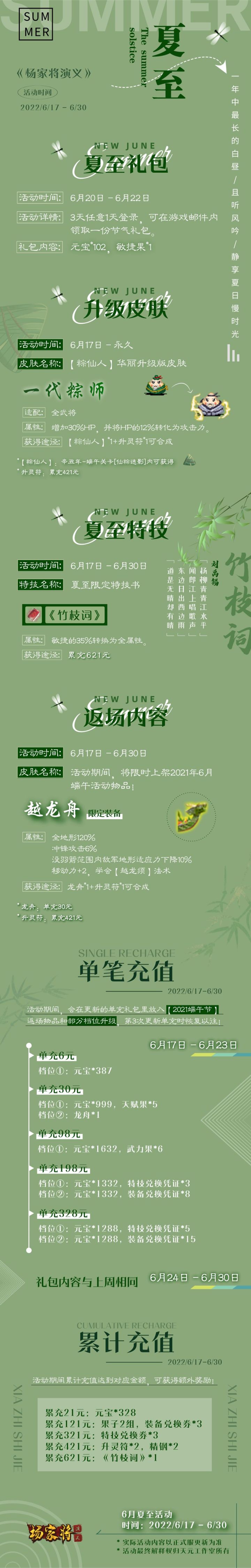 亲爱的杨家军们:夏日将至🌦,作为二十四节气之一,小编特为小将军送上一首刘禹锡的🌴夏至清凉诗句:《竹枝词》杨柳青青江水平,闻郎岸上踏歌声。东边日出西边雨,道是无晴却有晴。气候逐渐升温,避暑三伏,温馨提醒各位小将军提前做好消暑🧊准备呦~《杨家将演义》六月夏至活动时间:2022.6.17~6.30 【夏至】新品福利如下↓:• 1. 节气签到:夏至礼包• 2. 升级皮肤:【一代粽师