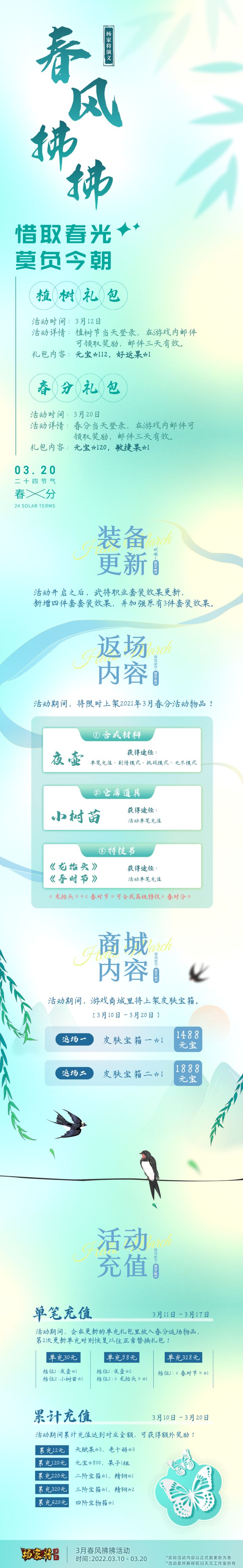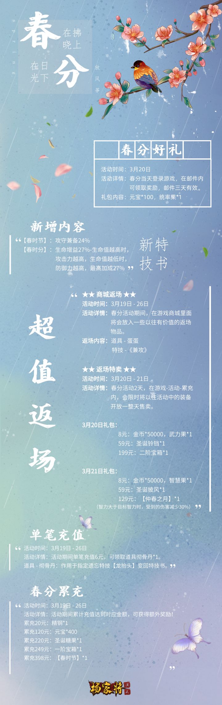 🌻亲爱的杨家军们🌼:“春半南阳西,柔桑过村坞。袅袅垂柳风,点点回塘雨。”春分,是二十四节气之一,也春季第四个节气!春分后,气候温和,雨水充沛,阳光明媚。被雨水滋润的种子🌱,也在逐渐微微露出苗头~三月季节即将到来,在这初暖🌺的日子里,《杨家将演义》祝小将军们春风得意,万事顺心🌺~【春风拂拂】特殊福利如下↓💐:🌲节日专属礼包🌲 植树节、春分礼包🌲武将装备更新🌲 新增并加强套装效果🌲