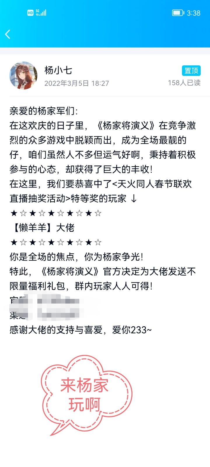 一次完全意想不到的经历没错就是这个题目,老实说我完全没有想到特等奖会落入我的怀中。之前期待的是三四等奖,比较喜欢三等奖按摩器。拿到了做大幸运儿的特等奖,心情一直非常开心和激动。去年周年庆入坑的杨家,我很爱这款游戏,结交了不少玩友。我一直坚信幸运是会降临的,在错过了三等奖后,我鼓励过自己,不到最后,天知道,渴望,强烈的渴望总会催生出奇迹。希望杨家越来越好,看到我废话的你也会幸运美好。希望杨家越来越好,希望杨家英魂庇佑每一个中华好儿女,希望大家都能实现自己心中的小小期待,希望大家从杨家结缘,这款游戏也能带给你一份运气,祝福大家好运连连