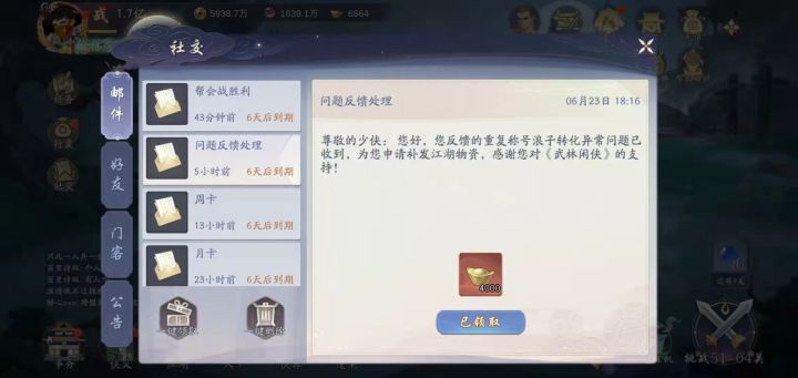岁中盛典抽奖有bug,阿闲请帮忙查数据 多次抽奖中了称号,但抽中后出去查看并没有新增或者重复的有升级和兑换的称号江湖编号:10867441676服务器:蜀山64服ID:念白