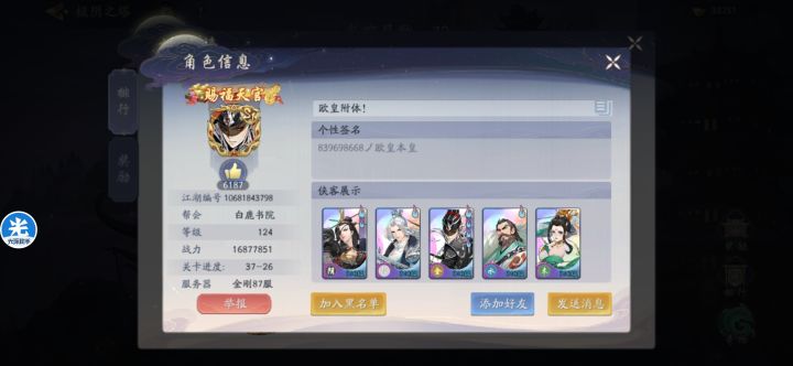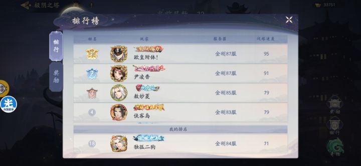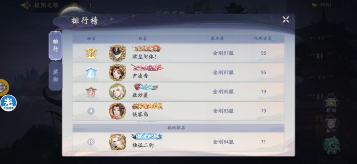 金刚87服,两个科技玩家,一位1800w战力(欧皇附体),一位3900w战力(伊凌香)。先是欧皇附体极阴塔打到95层。我问他是否开科技,否认,回答过了85层之后npc都是几百万战力(我询问了游戏群的大佬,大佬们否认过85层之后npc战力BUG),并且说和伊凌香研究了一天苗疆都没打(为接下来的事情做铺垫)果不其然,伊凌香短短十分钟之内从85层打到95层。 只能说科技使人强大! 别人一俩亿的的大佬卡79层,他俩一路过五关斩六将直接拿95层称号,牛! 附送证据图(最后一张是别区大佬87层图)