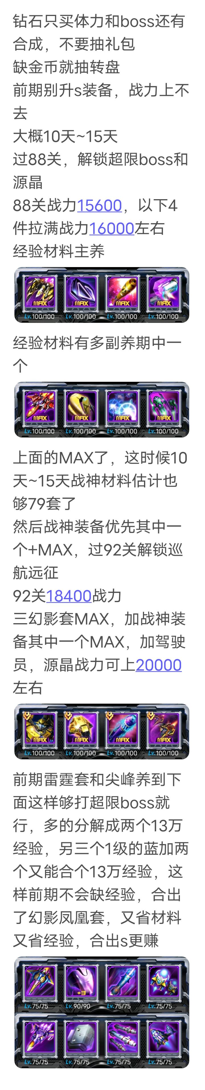 一、前期核心逻辑:优先普通战神速成优势材料来源简单:通过小组赛宝箱、BOSS挑战、无尽日常快速收集雷霆无双/强袭斗士装备战力提升直接:解锁强袭战神/无双战神可解决新手期经验、金币、进阶材料短缺问题资源对比优势相比S级战神(如悍将/神锋),普通战神养成速度快3倍同期战力可领先30%-50%可持续发展满配后解锁超限/超频装备后期反向改造可批量产出S级装备二、毕业装备全攻略核心输出
