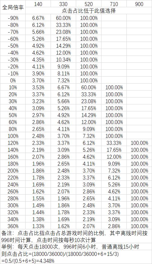 计算了不同倍率下三段变身的选择(见下表)公式在图表下面(方便看清趋势的图表)公式:点击时间占比 x全局倍率(含二段变身后)E一段变身等级 A(总单位游戏时间下)点击收益=x*(1+E)*(10(1+A)+2)公式说明:习得龙语后,每次点击获得(A+1)秒收益,每秒10次点击,同时有资本主义的2次正常生产挂机收益=(1-x)*(1+E)*3公式说明:开启996后,每秒获得3次收
