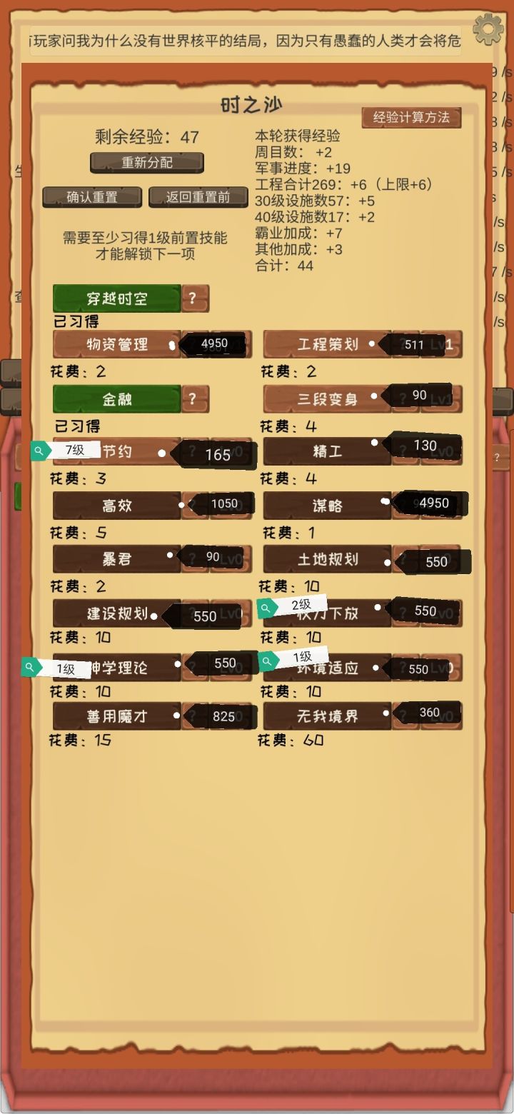 经验时之沙界面各项目全部点满,各总共需要经验点数。以及结局、成就、龙珠许愿前置条件等级汇总。因为后面三四个我没点开过,如有算错请大佬指正。做这个主要是为了更直观看需求数量,方便大家点击的判断。本来还想做精神修炼界面的,可惜我已经点满很多项目了。