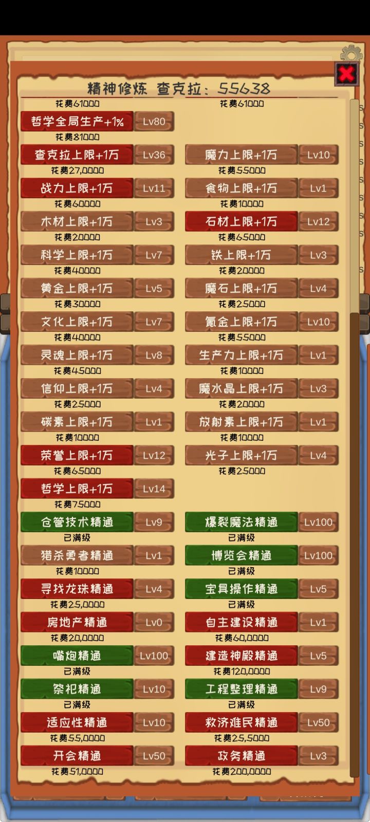 精神之力——自带的精神修炼——最高一级需要400w查克拉,需要万魔殿的各个魔殿的最高等级配合,平均20级就可以400w多查克拉上限,不用太急着追求这个+4,我当时是30多后面才弄的满级,在你上限没有500的时候可以放缓这个潘多拉魔盒——没什么好说的,点一级就够了无我境界——尽早通过刷周目的方式点满,每个周目打完军事(或者打到打不过去为止,演算力不足之类的),越早越好万魔殿100级和400级