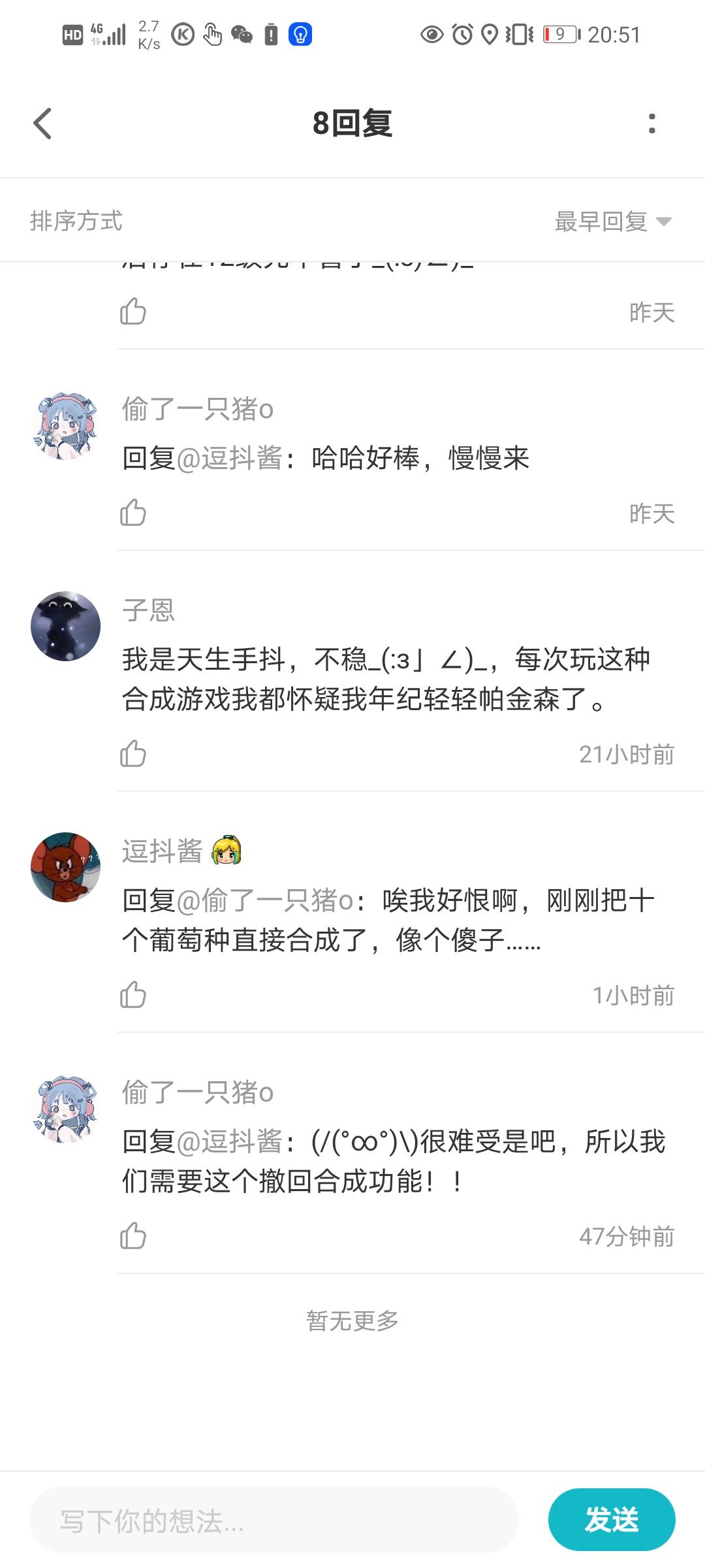 强烈建议出一个一键整理或者合成的功能,就像这个宠物蛋合成界面一样,很清爽。合成阳光、树苗需要单调重复的次数太多了,会降低趣味性。同类游戏也有这个毛病。幻兽爱合成、合成龙也玩过。你要是出这个功能那我很情愿掏钱。一直点击、移动真手酸。