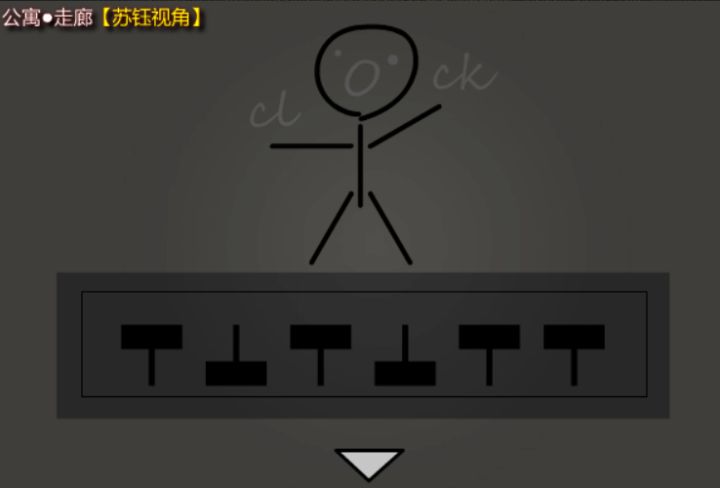公寓·走廊墙上的火柴人密码由上下两部分构成。上半部分的火柴人有两种不同类型,一种是左手平放,一种是左手抬起。火柴人身体是五个“1”,头是一个“0”,而cl o ck则提示和钟表联系到一起。于是我们将火柴人放置到钟表当中,发现火柴人的四肢及躯干都直接或者间接(反向延长)指向了表上的数字,因为游戏内的钟表只有六个档位。将火柴人可以指向的档位记作1,不可以指向的档位记作0,头部代表0用于补位。顺时针看