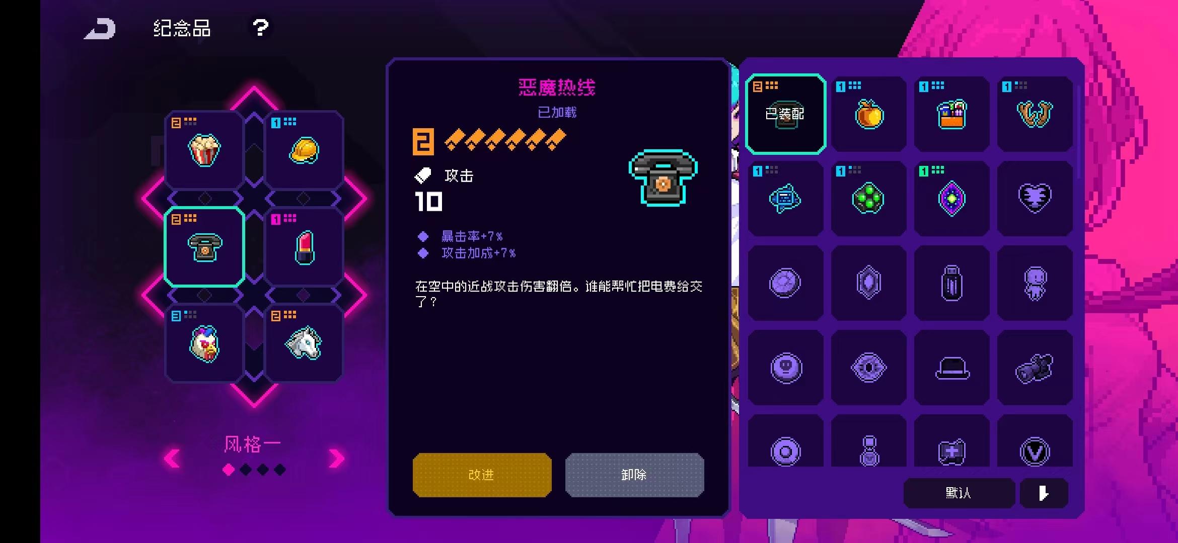 纱夜半成型纪念品套装爆米花破石头(后续换成“磨刀石”)安全帽(免疫陷阱)照顾手残过去不去陷阱【后期有条件换“球衣”或者“饥饿护符”】恶魔热线空中伤害加倍口红刷新商店(后续可以换“毛巾”)鸡头刷蛋增加近战伤害天马触发恶魔热线被动(有没有一种感觉,用过飞行道具之后就不会走路了...)