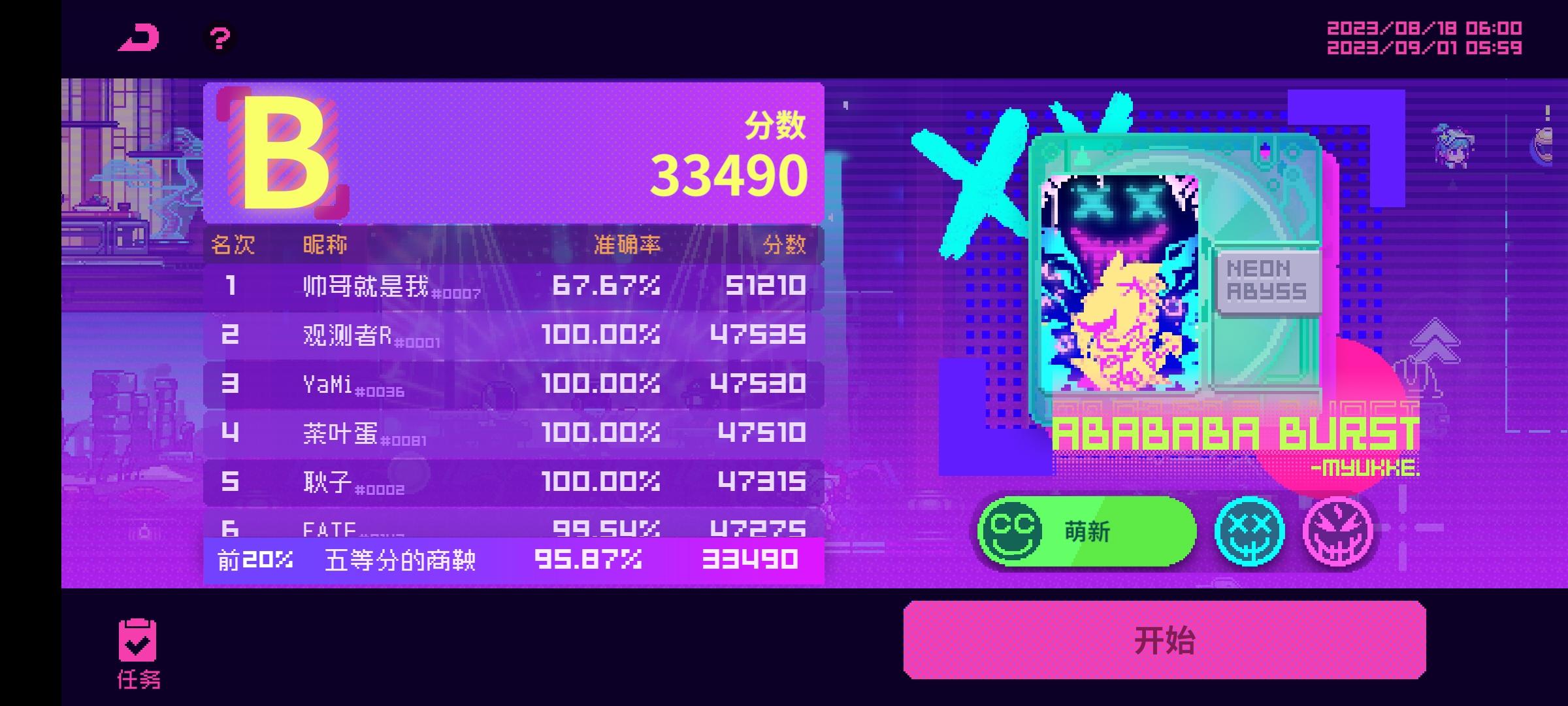 今天上线,心血来潮,想看一下,结果一看不得了,这一个小活动竟然还有人开挂,萌新模式2/3的准确率都五万多分,这不是挂,是什么?还有高手模式,直接就不演了,准确率还不到100%,比第二名高了四万分,好好好,这么玩是吧?官方赶紧出来管一下吧!#吃瓜爆料#霓虹深渊无限