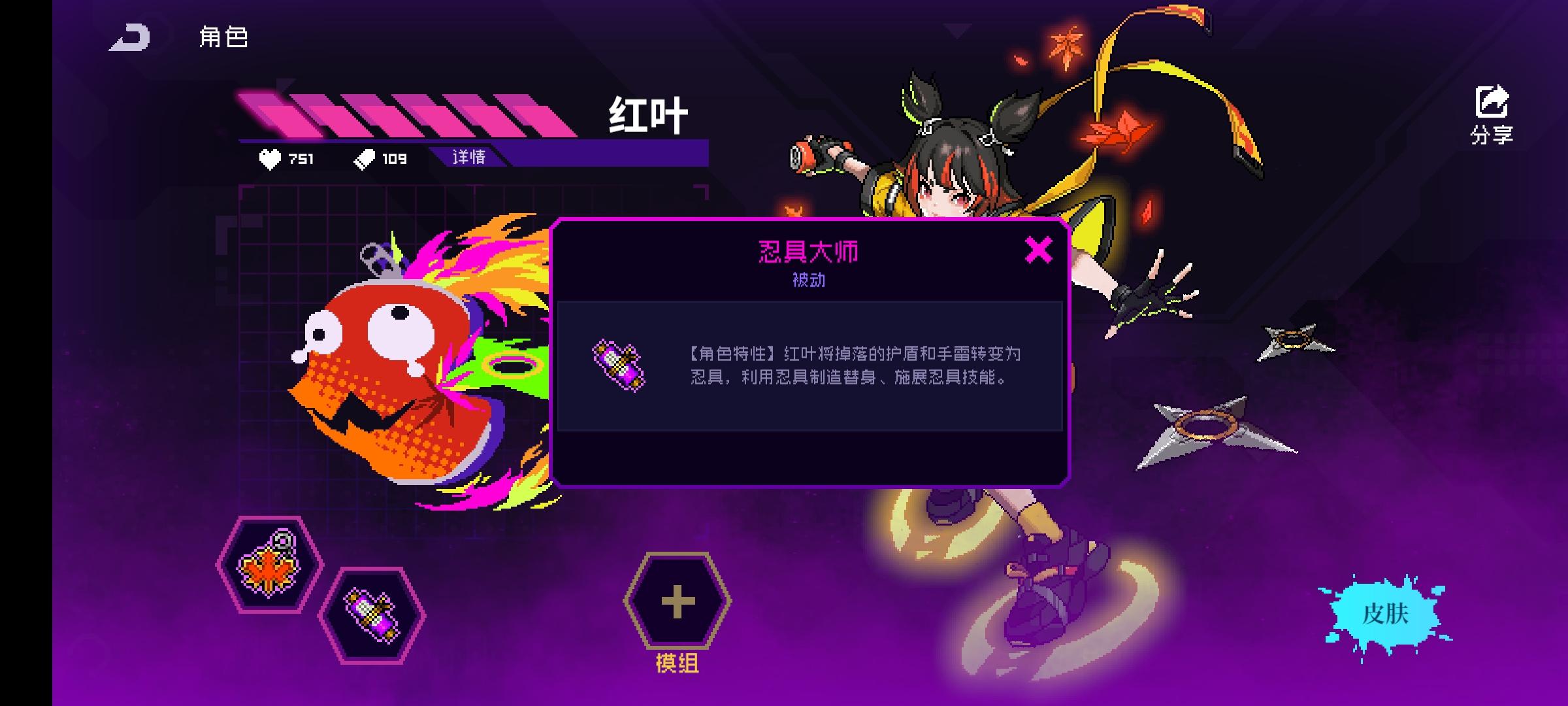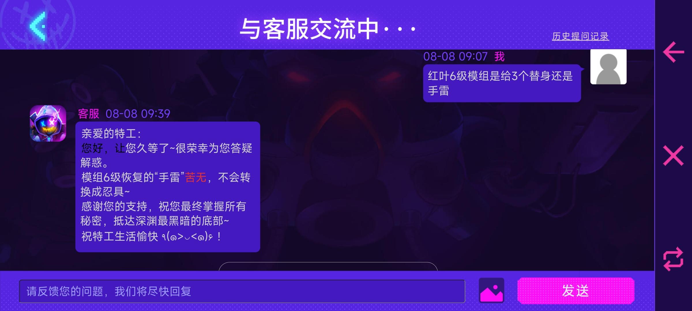 先上图从图一红叶的技能描述以来看,手雷和护盾的掉落物称之为“忍具”,而我们在实战中发现,“忍具”是以苦无的小图标来表示,并且拾取到之后,优先会恢复替身,替身满之后才会转为手雷。所以,当大家看到红叶六级模组的描述(图二):立刻获得三枚忍具。就立刻想当然的:获得忍具=优先恢复3个替身=无敌。可今天刷论坛时偶然看到了这么一条回复(图三),我立马找客服验证事情的真伪。结果让难以置信的事情来了,如图四所示