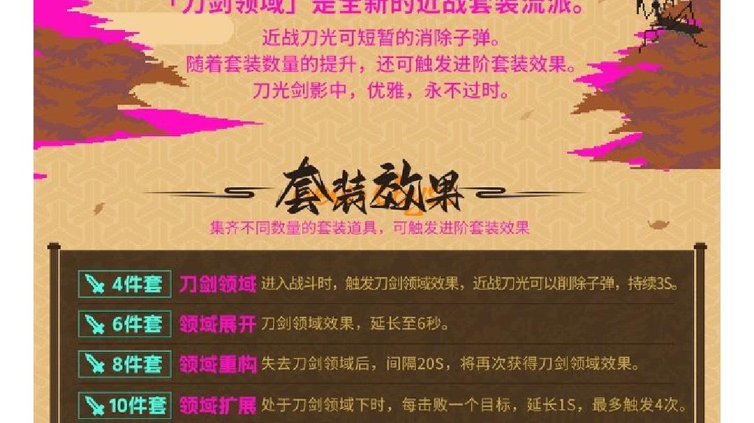 ①四件套效果为进入战斗时触发领域,持续3s,这个其实效果一般,顶多能发挥到一秒多的作用,如果是从出怪开始算的话还可以,毕竟小房间三秒可能够用,并且刀剑领域还会增加攻击范围。(评价为中等稍微偏下)