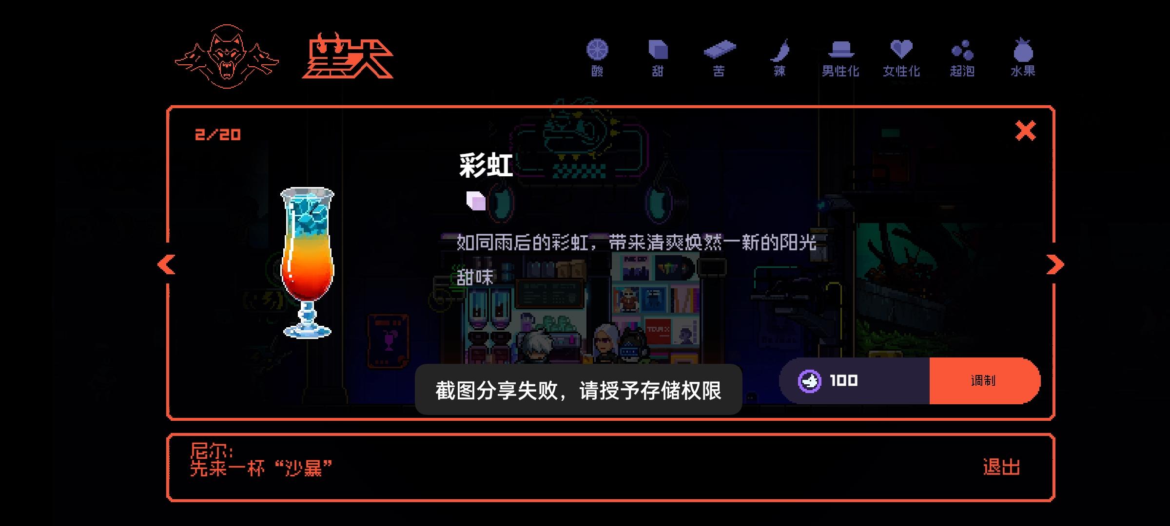 有个剧情的bug,尼尔结局选项选完后再来点酒的时候,不给他沙暴而是给彩虹,他就会又触发之前的剧情,然后可以一直循环(赖着不给钱)😓