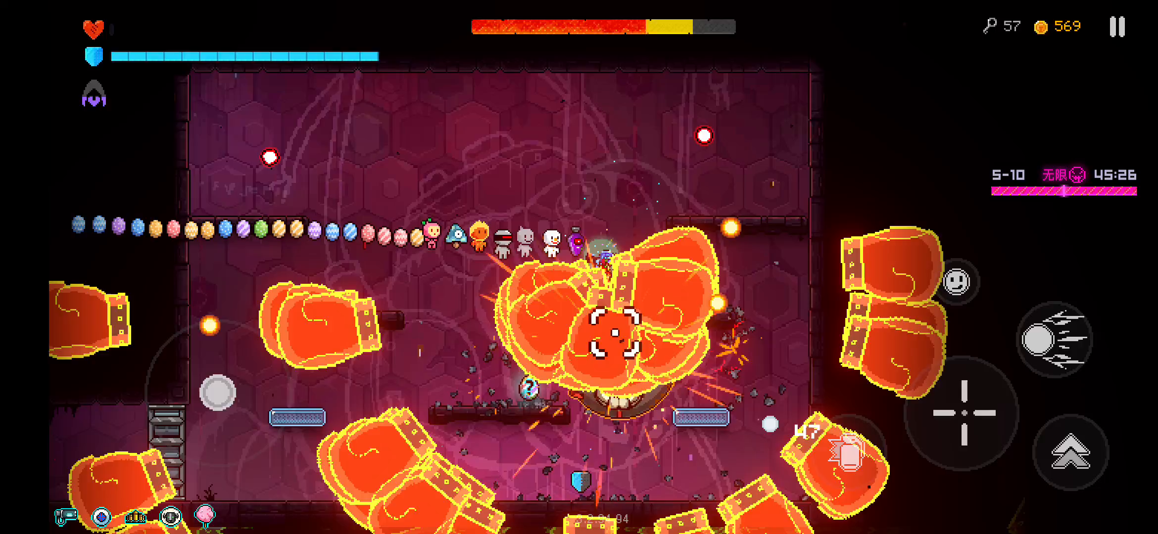 橘宝+比特币之神+飞行=无限道具 提示:想收菜的时候一定要先捡道具再打boss,boss变更为二阶段的时候会清除场地内的道具(关闭自动射击和跳跃射击)
