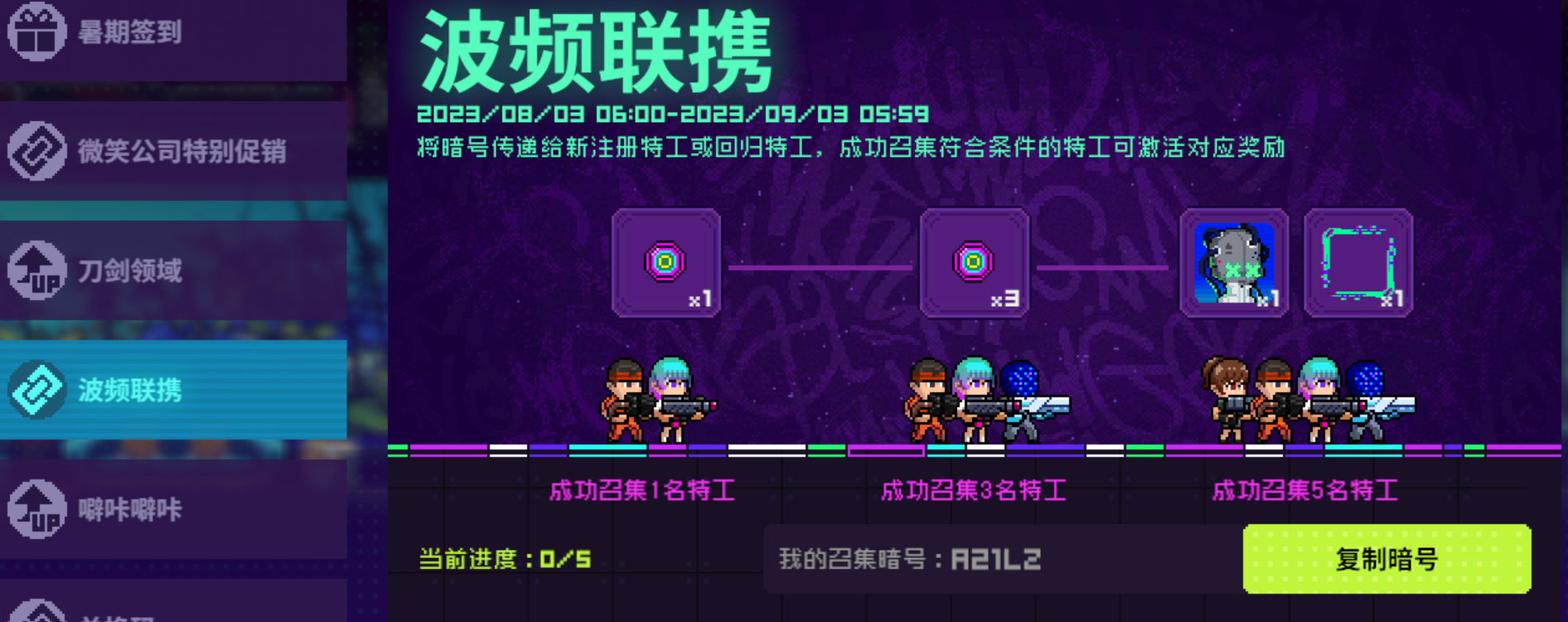 我的召唤暗号:A21LZ 有回归或者想玩的求求帮忙填一下,有奖励的。