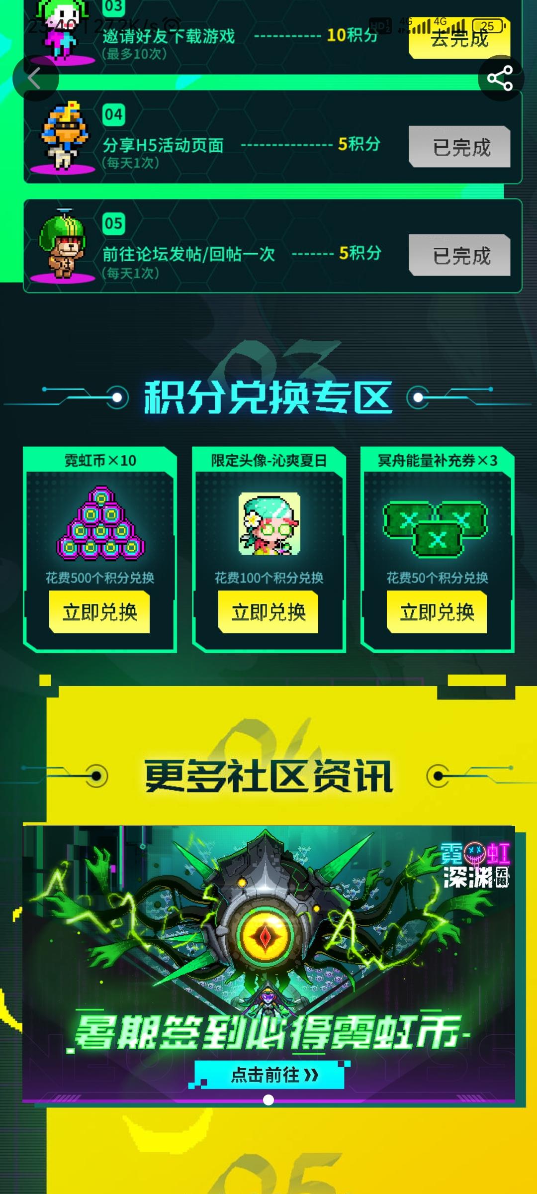 原本想攒一下10霓虹币兑换的,结果看到需要500积分,每天可获得10积分,所以需要累计50天签到,还不能漏签(兑换数量应该很少),缺一天可能就被换完了。也就是说需要连续近两个月不停签到,提醒自己不能忘。另外关于签到15天领奖励2币,后面两个特殊卡基本不可能出,不信康康你的。而且,其他游戏签到时间基本全改成7天了,每一天都有丰厚奖励,只有你游要签15天还给的垃圾。但凡勤快点,每天花15分钟做一下日