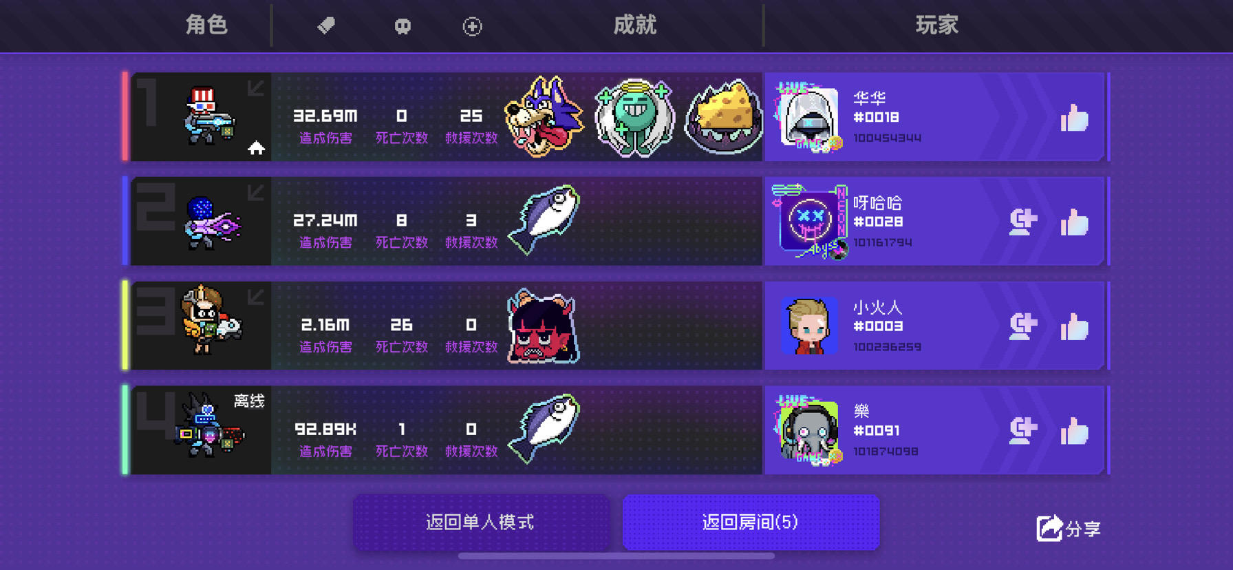 四人联机打的,开局掉线了一个,打到第三层捡到姜饼人,只要队友不退我们应该能过,最后两个boss满屏子弹,什么也看不清,全靠无限复活抗过去的
