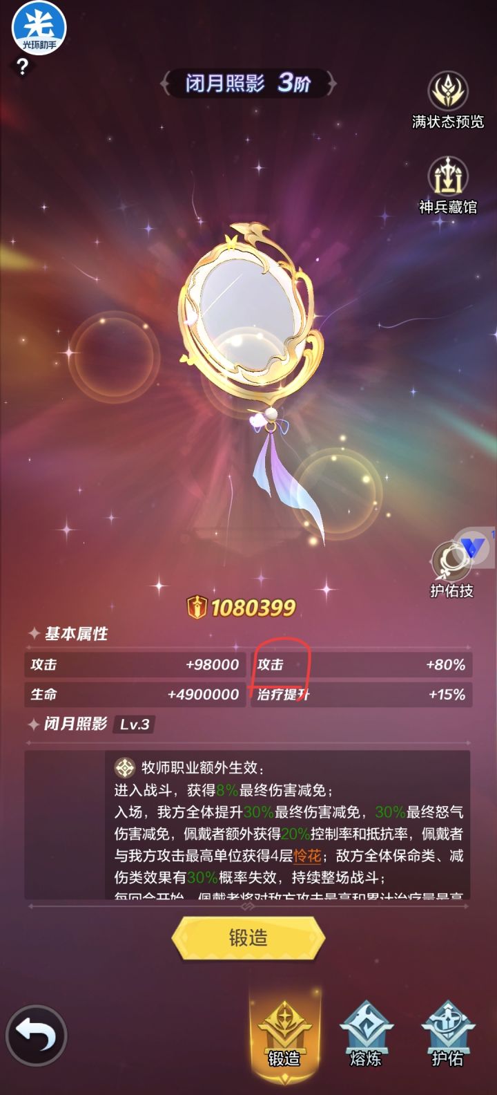 角色uid:bug描述:牧师神兵通用属性“生命”显示为“攻击”,专属英雄技能攻击是生命百分比,可能神兵属性显示错误了