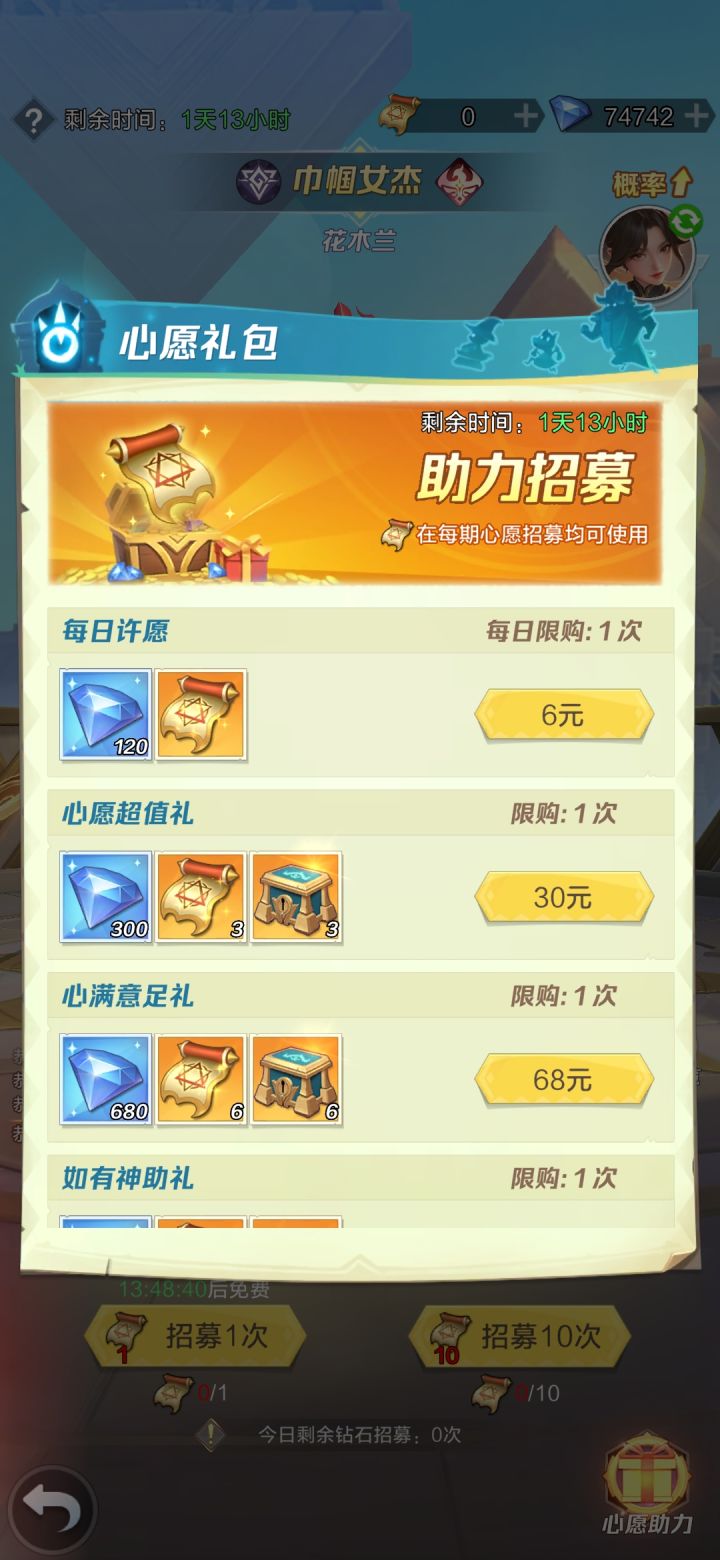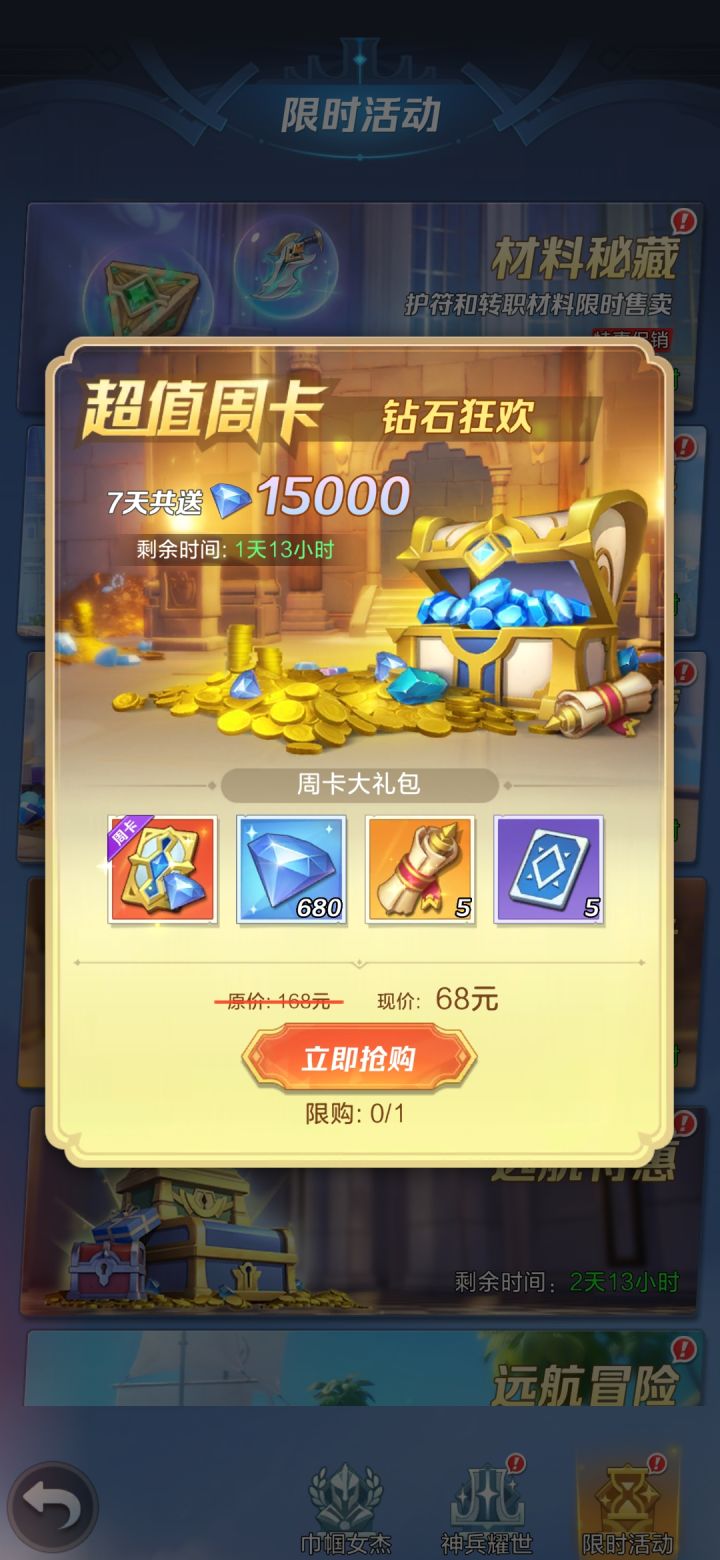 本期木兰心愿还差37次再招到一个本体就能上10星开潜能了,算上明天的20次钻石招募和免费的1次,以及满300次送的10个招募券,还差6次才能以保底。大佬帮忙评估一下花68得6个招募券直接上10星值,还是充68钻石周卡(15000钻),等着木兰皮肤返场?策划之前说新光暗英雄会放缓节奏,两个月一次,比较担心木兰的返场会延期。目前的阵容也能经常越点8000万以上的,有时还能越战1亿战力的。木兰的