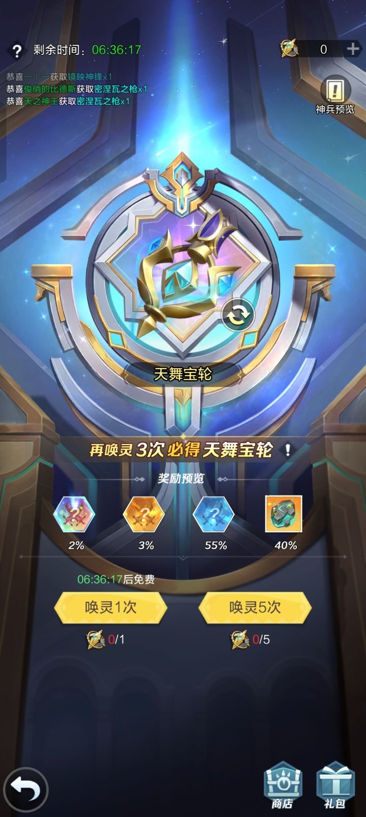 请问这个次数下次神兵会重置吗?下次是三次必得天舞宝轮,还是又50%概率