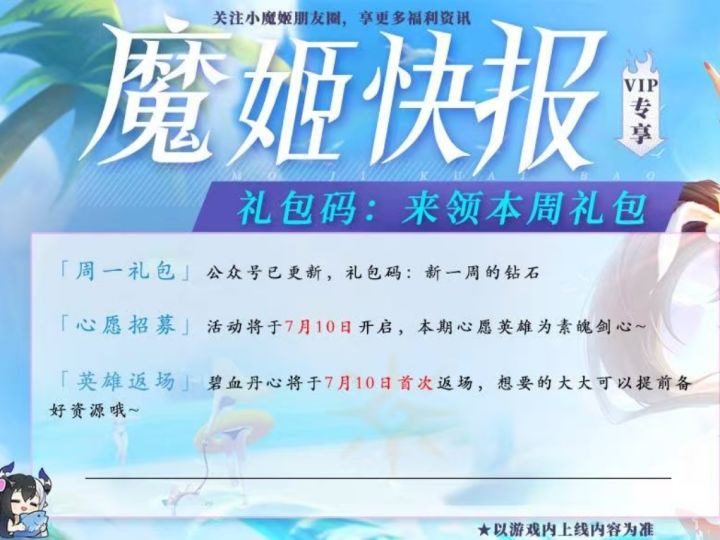普通码:新一周的钻石vip(v10及以上可用):来领本周礼包周四穆桂英首次返场 常规心愿莫邪周六预计新东西