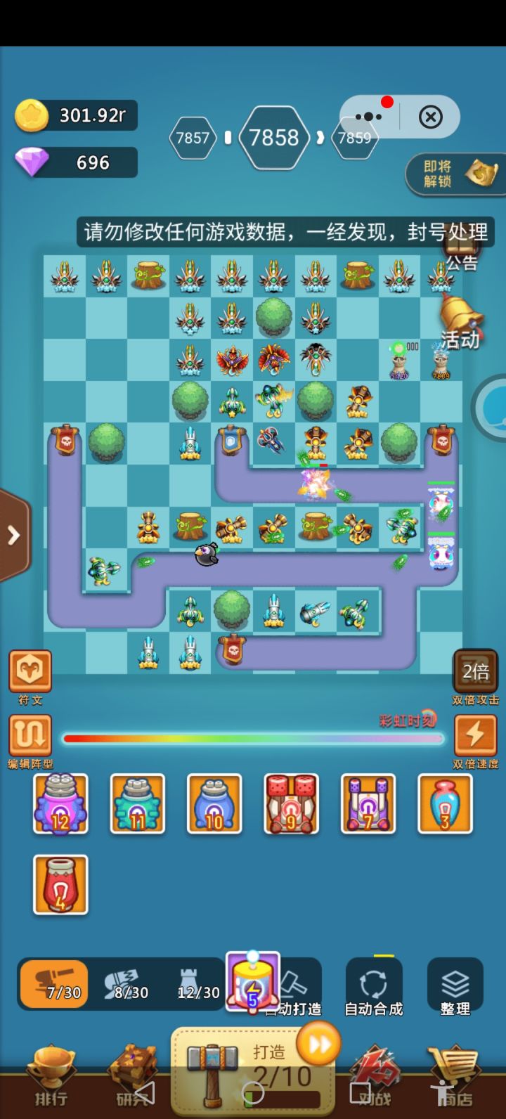 玩这个游戏也有快一个月了,总的来说还是不错的,提点建议。1.宠物装备建议增加锁定功能,锁定的装备必须先解锁才能卖出,避免操作失误将好久才刷到的矿工错卖。2.每次换新地图很容易造成十级魔法炮跟圣洁自动合成高级或者高星炮这方面应该优化下,毕竟都是玩家辛苦攒的。3.双倍速度是否可以开放钻石使用,毕竟1500关后没有橙炮过关时间太慢了,除了消耗手机电量还会让新手没有玩下去的动力。4.尽快开发出一些