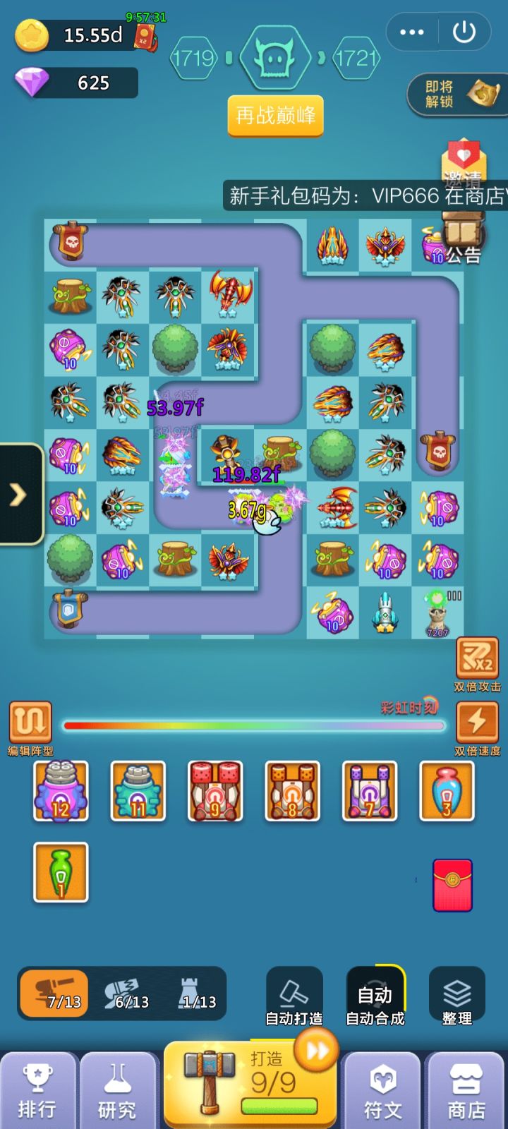 2.每天做任务赚钻石,双倍攻击和加速打造点一次就行了,每天可以白嫖一次20砖石的兑换金币。