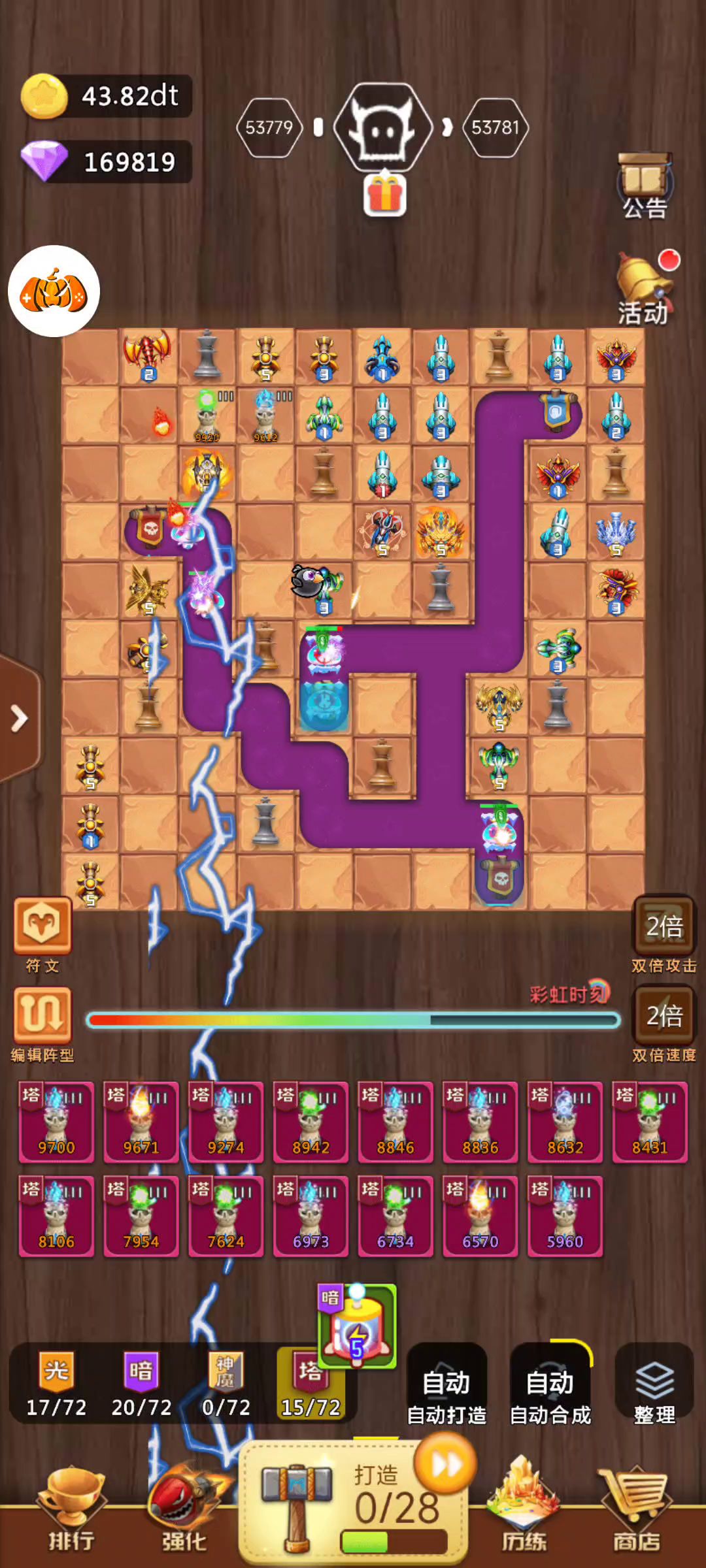本期讲一下对战,可能对萌新有点用。路线图:可以参考我的图,前期没技能就要把路线延长一点,后边技能多了再换。炮台:没炸裂的时候就要靠火龙 定海,优先度:火龙 定海>圣洁>红毒>蓝毒>凤翼>圣剑 弹射 巨阙 碧水 圣光 青莲。群炮往出怪口摆,定海摆在凸出的位置最佳,单体靠后摆清BOSS。技能选择:技能分主动和被动,被动技能六个:贪财 急速 炸裂 迟钝 鞭策 强化。贪财和急速这两个便宜,只要25碎