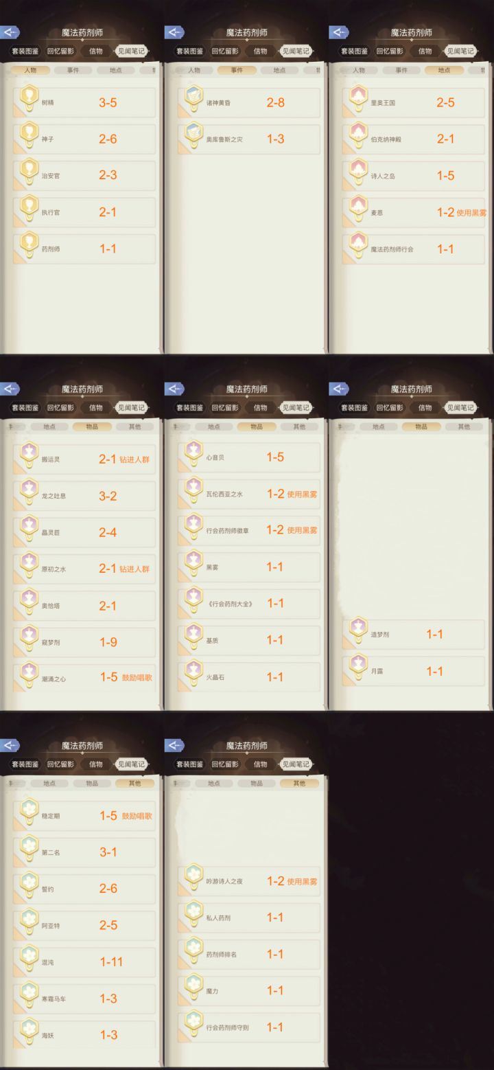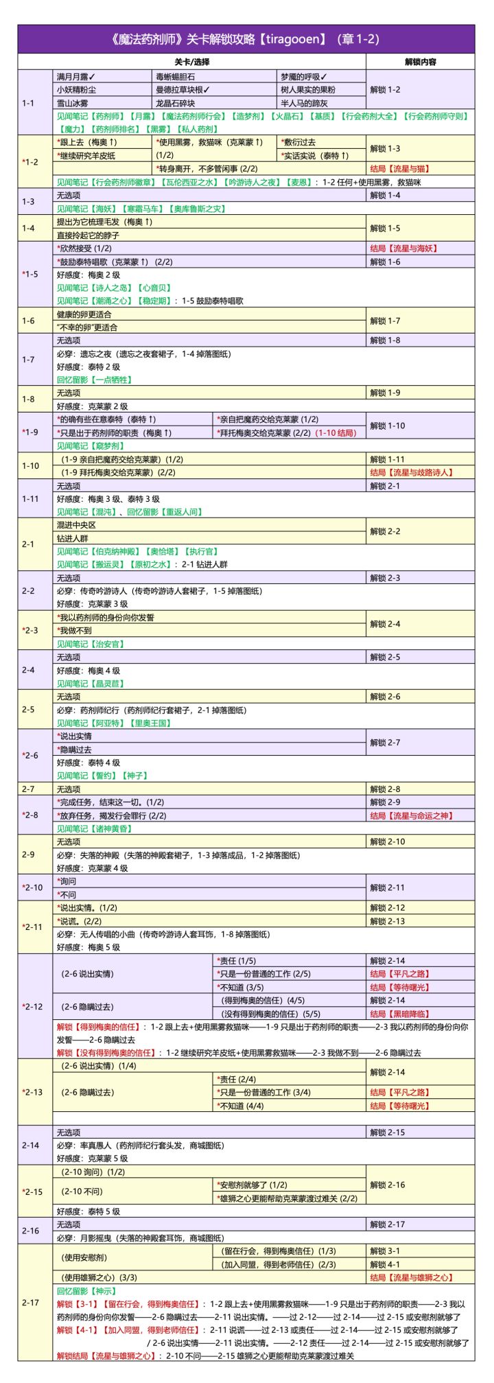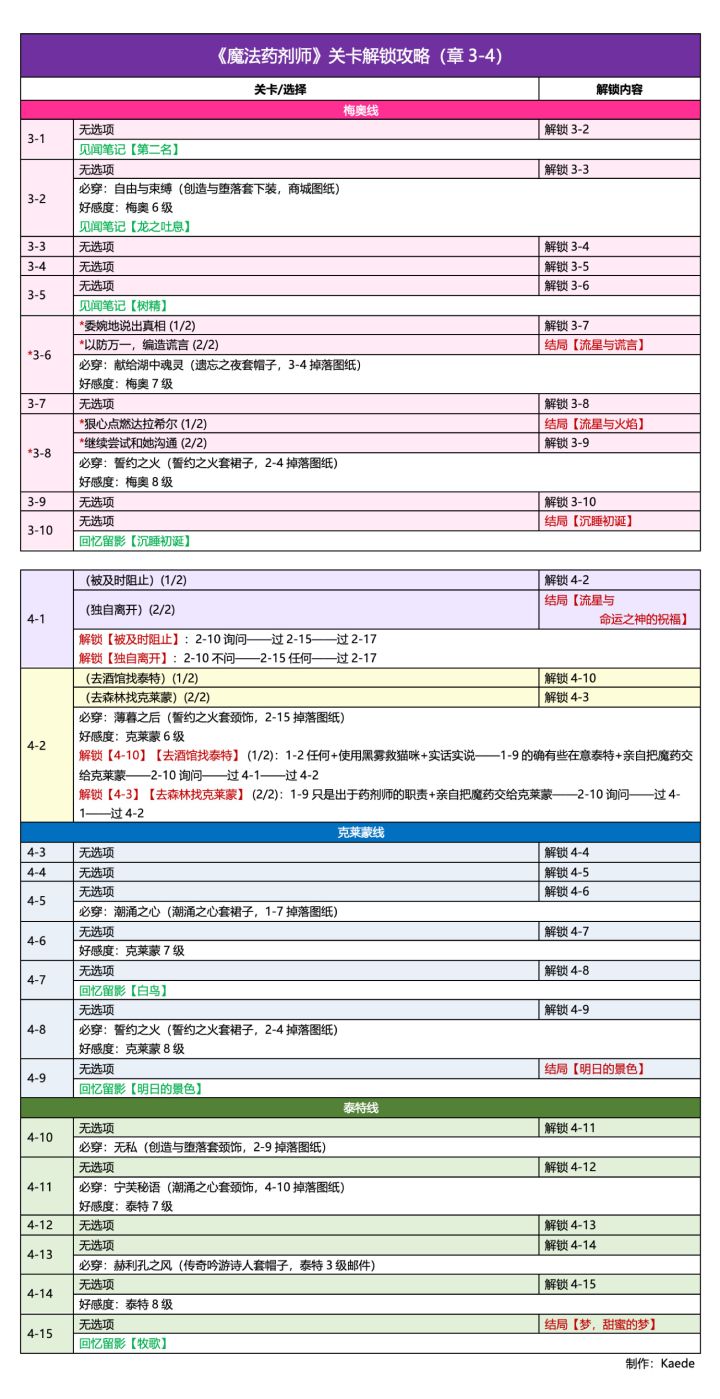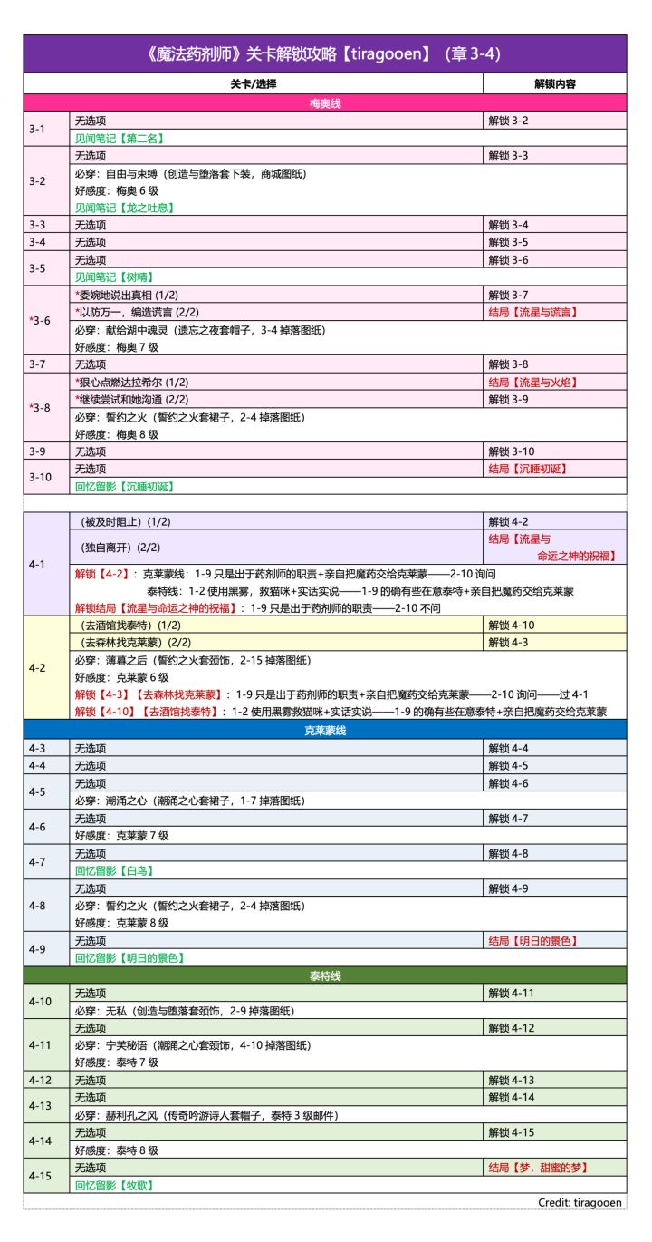 🍀《魔法药剂师》关卡解锁攻略 / 必做 / 见闻 / 留影好感度:梅奥8级、泰特8级(五星信物)、克莱蒙8级需要材料非常多,关卡分数较高,不建议新手开有走不通的地方欢迎指出更新:增加最后两张 tiragooen 攻略直翻,解锁有些复杂,多些参考