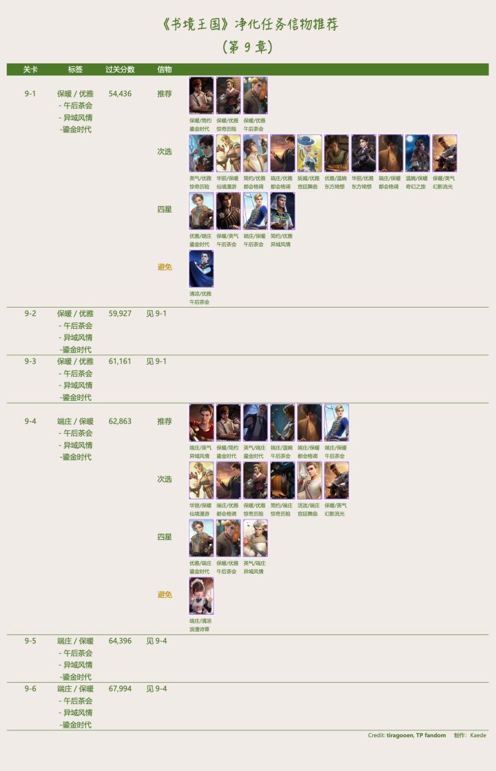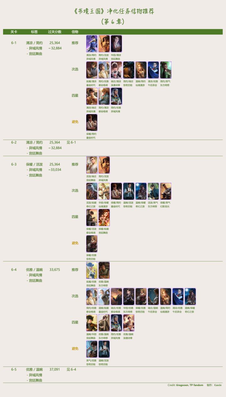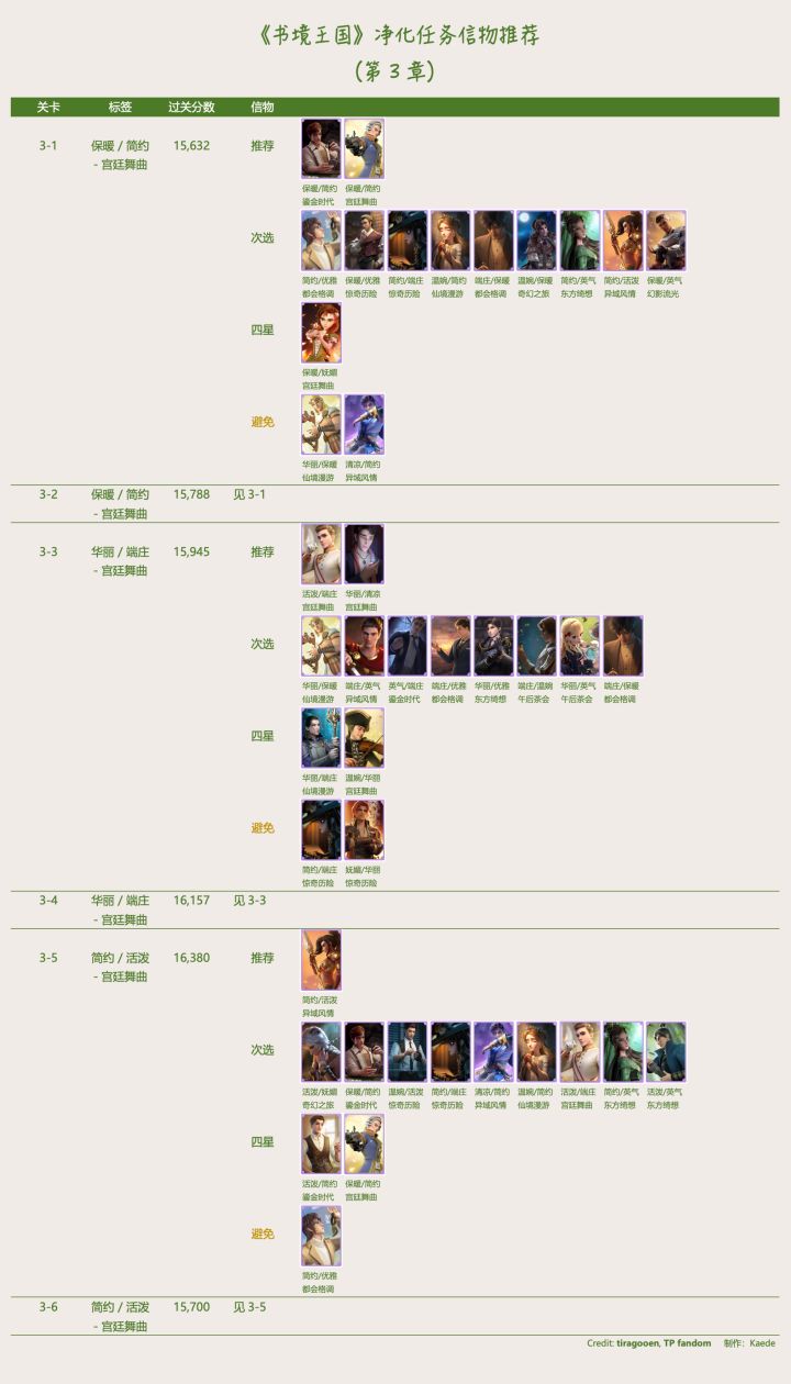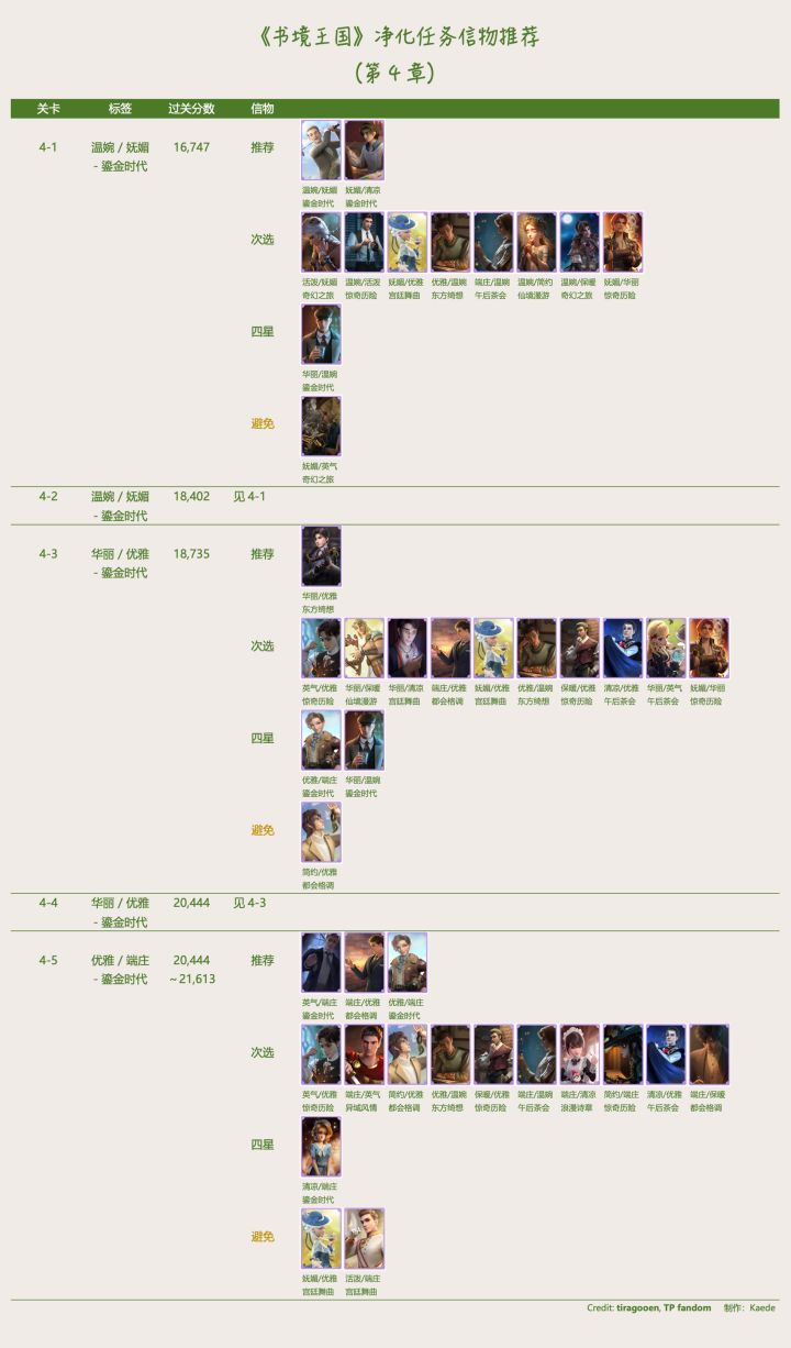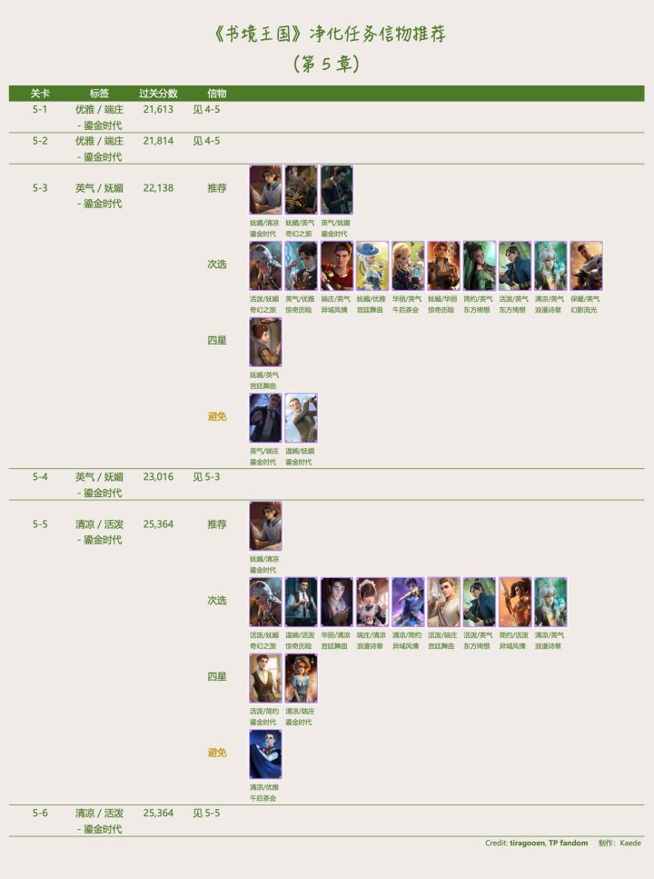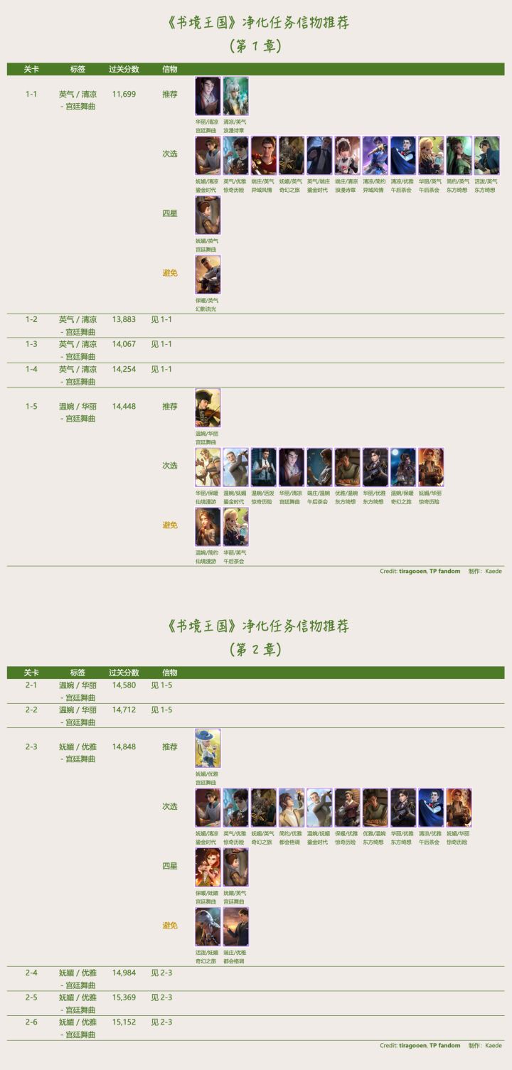 🔰 《书境王国》净化信物推荐- 【推荐】尽量使用,其中所列 4 星信物只有等级非常高且觉醒才推荐。- 【次选】没有足够 ”推荐“ 信物,或 ”次选“ 信物等级特别高。- 【四星】只有特别完美等级高又觉醒时推荐。一般使用前两项信物较好。- 【避免】虽然至少符合一项风格,但另一风格和要求矛盾,会扣分。- 当有情景标签,尽量符合 < 情景 + 至少 1 风格 >,没有情景卡的话 < 2 风格