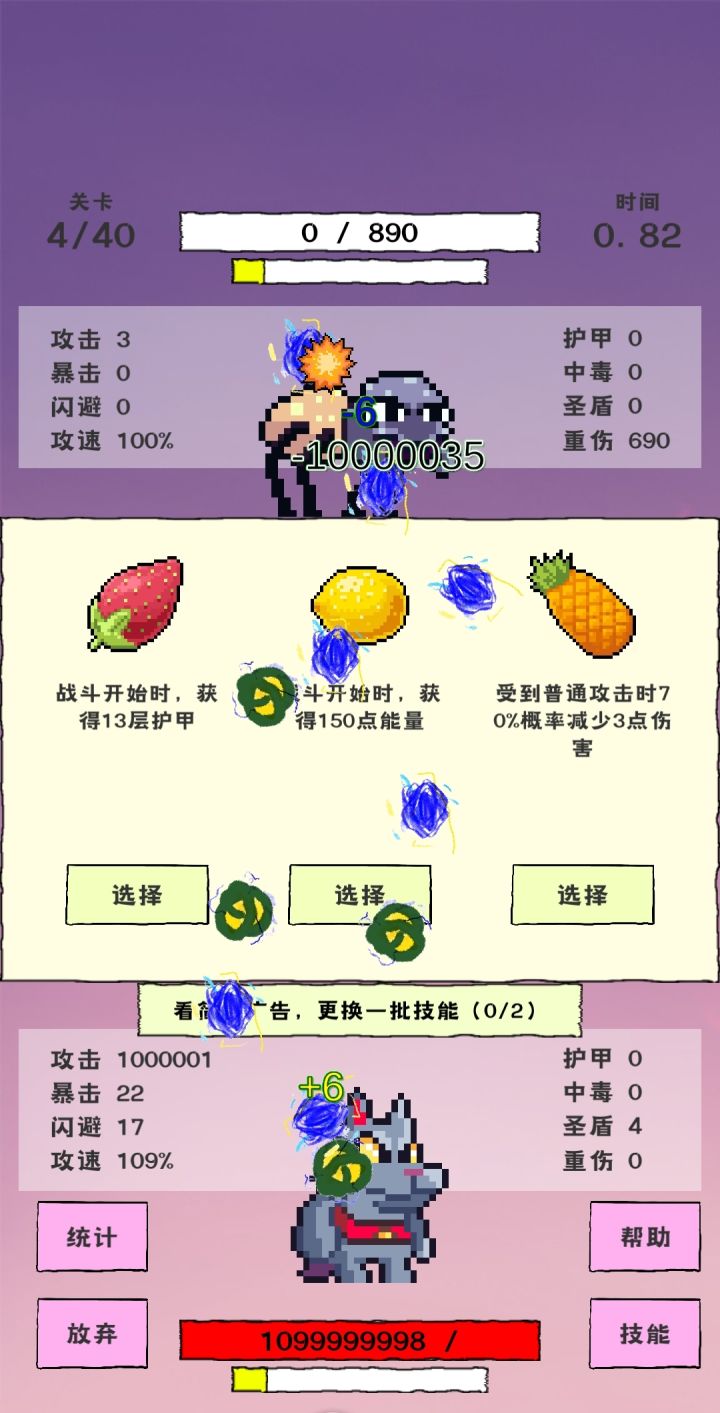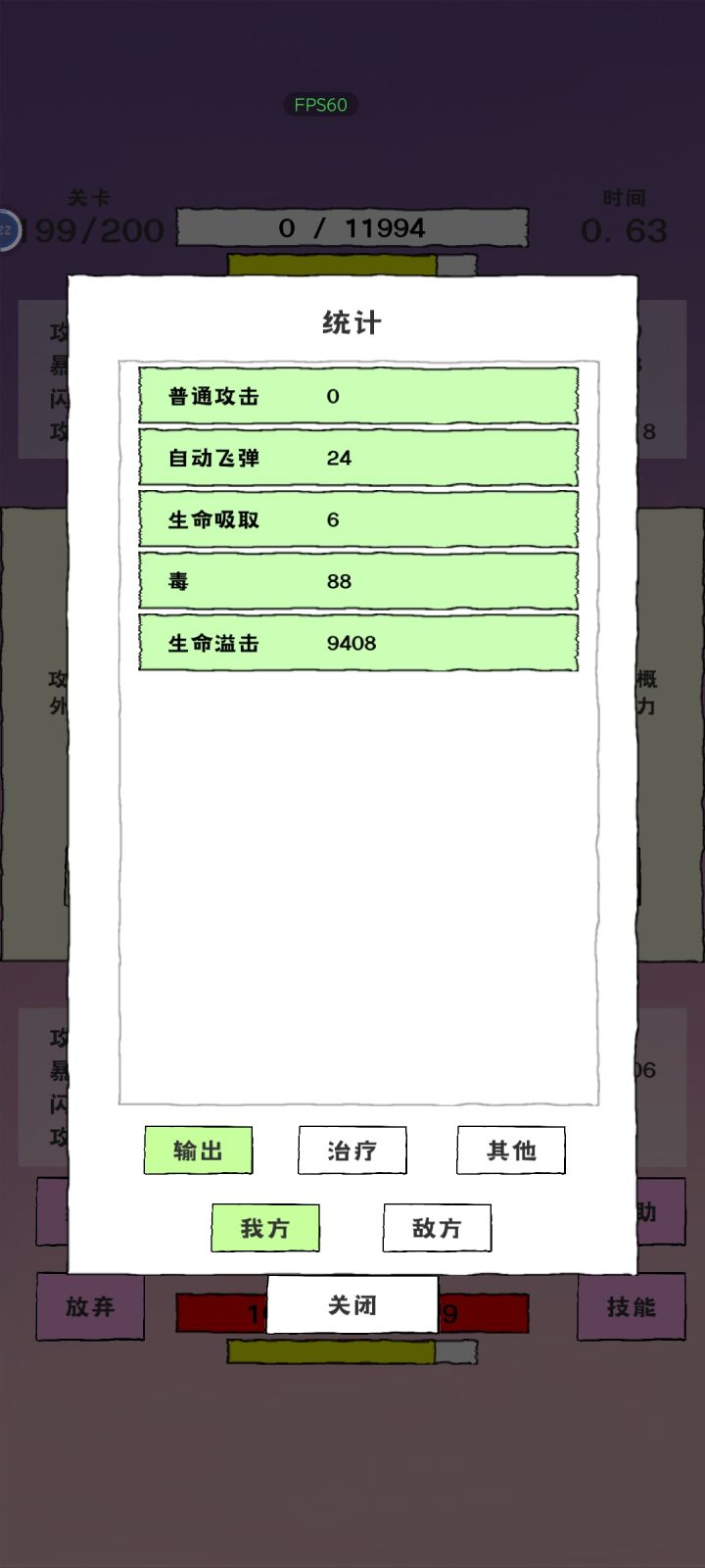 打了2天终于通关了,走了很多弯路,这里简单的总结一下,给后来者一些建议。先贴一个通关图☞第一:有钱就依次训练闪避、血量、攻击、暴击,不要买角色,角色差别不大,浪费钱!第二:技能只选回血技能和闪避技能,任何加闪避的都不要放过。输出不要加攻击和暴击,切记切记!特别是第十一世界的BOSS,你攻击越高暴击越高攻速越快你死的越快,因为这弟弟浑身都是反骨(反弹伤害)过不去是因为你被自己的攻击秒杀了第三: